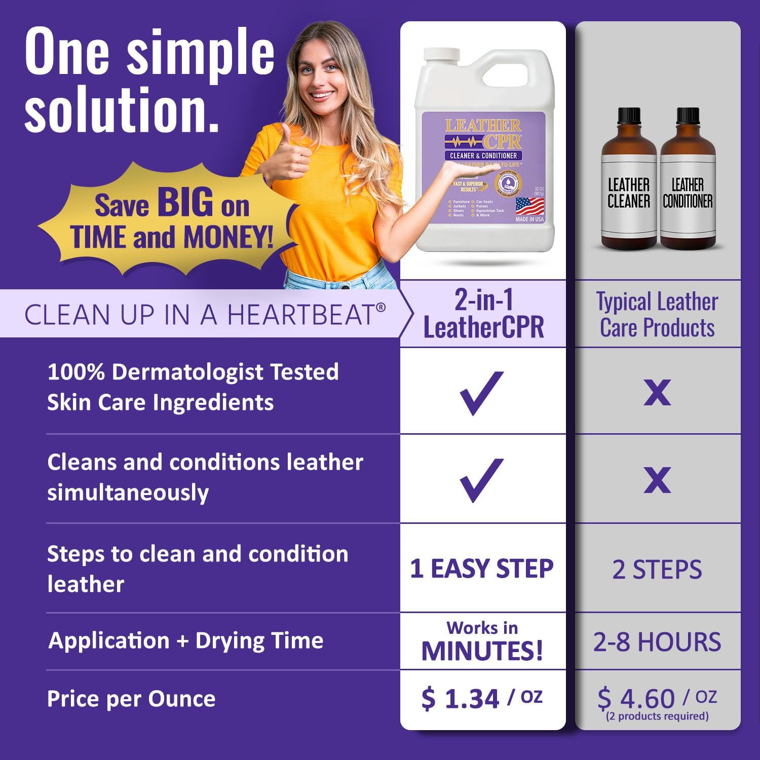 • CPR Cleaning Products Outperforms for You: Leather CPR was created to fill a void in leather care products, delivering exceptional performance trusted by high-end retailers, car manufacturers, and leather enthusiasts worldwide for over two decades. Our professional leather cleaner outshines competitors, ensuring your leather furniture, leather couches, car seats, and more stay pristine. Experience the difference in leather furniture care with Leather CPR—the ultimate leather protector.