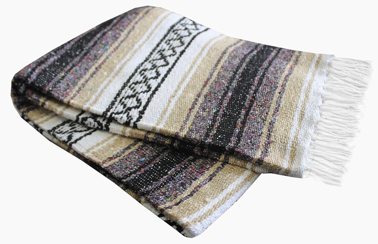 • QUALITY: Del Mex falsa blankets are thick and made to last. They are crafted from a soft blend of cotton & recycled acrylic and boast a higher cotton content than cheap knock-offs. Additionally, the edges are folded instead of sewn for added strength & style. Dimensions: 75" x 50" with additional 3" fringe on each end.