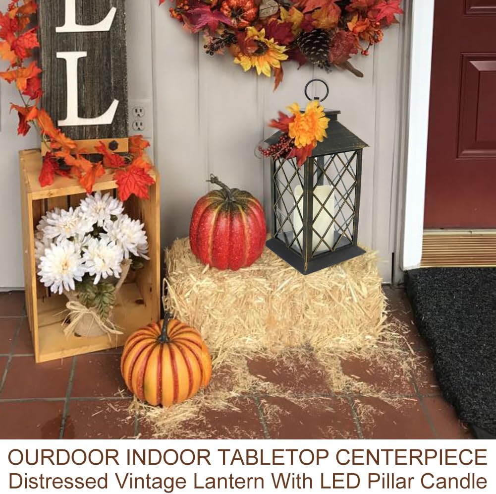 • LIFE-SIZE VINTAGE LANTERN WITH LED PILLAR CANDLE - The life-size vintage candle lantern, with toughened glass panes, cross grids and DISTRESSED GOLD Metal Looking Coating, creates an aura of old world charm - Made of lightweight PP thermoplastic that is heat and moisture resistant - A big LED bisque pillar candle with the Warm White flicker - A graceful marriage of beauty & practicality adds a gorgeous touch anywhere - Eye-catching prop for tables, bars, patios; fabulous indoor & outdoor decor.