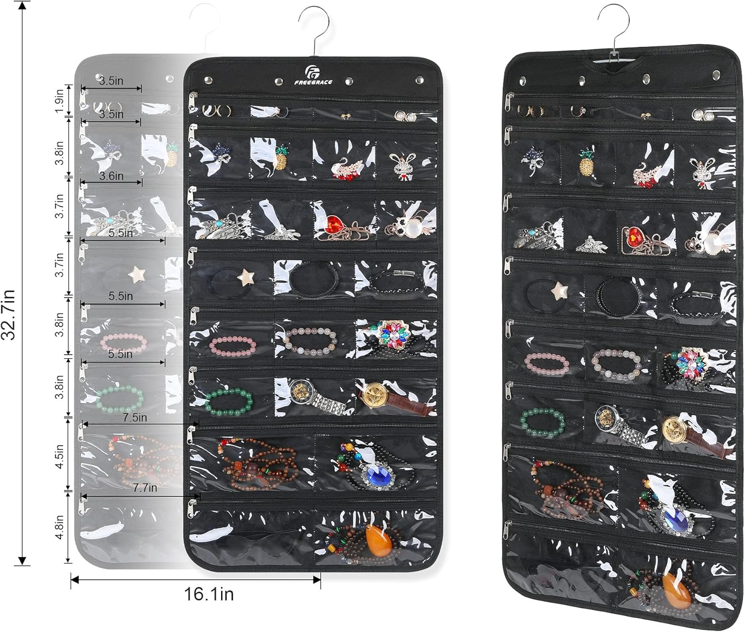 • QUALITY MATERIALS: Freegrace’s sturdy hanging jewelry organizer is made of 600D polyester Oxford fabric and has a PU backing (SIZE: 32.7’’ x 16.5’’). The pockets are made of transparent PVC to allow you to see through to the stored jewelry, and the zipper and revolving metal hanger are well-made and durable.