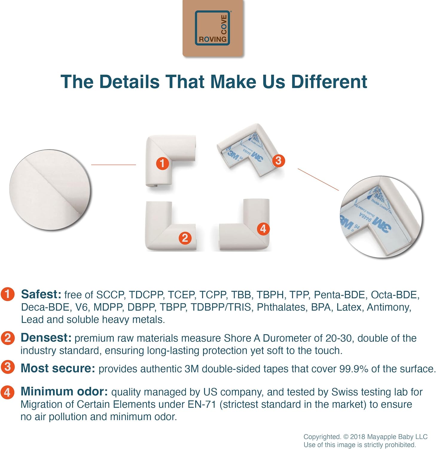• CLEAN SAFETY: Roving Cove uses safe and pure raw material and was the first brand to make foam safety bumpers without the use of toxic flame-retardant chemicals (SCCPs). Our corner protector contains no BPA, no phthalates, no heavy metals, no latex, no SCCPs. Inherently flame-resistant; passed flammability tests under US regulations.