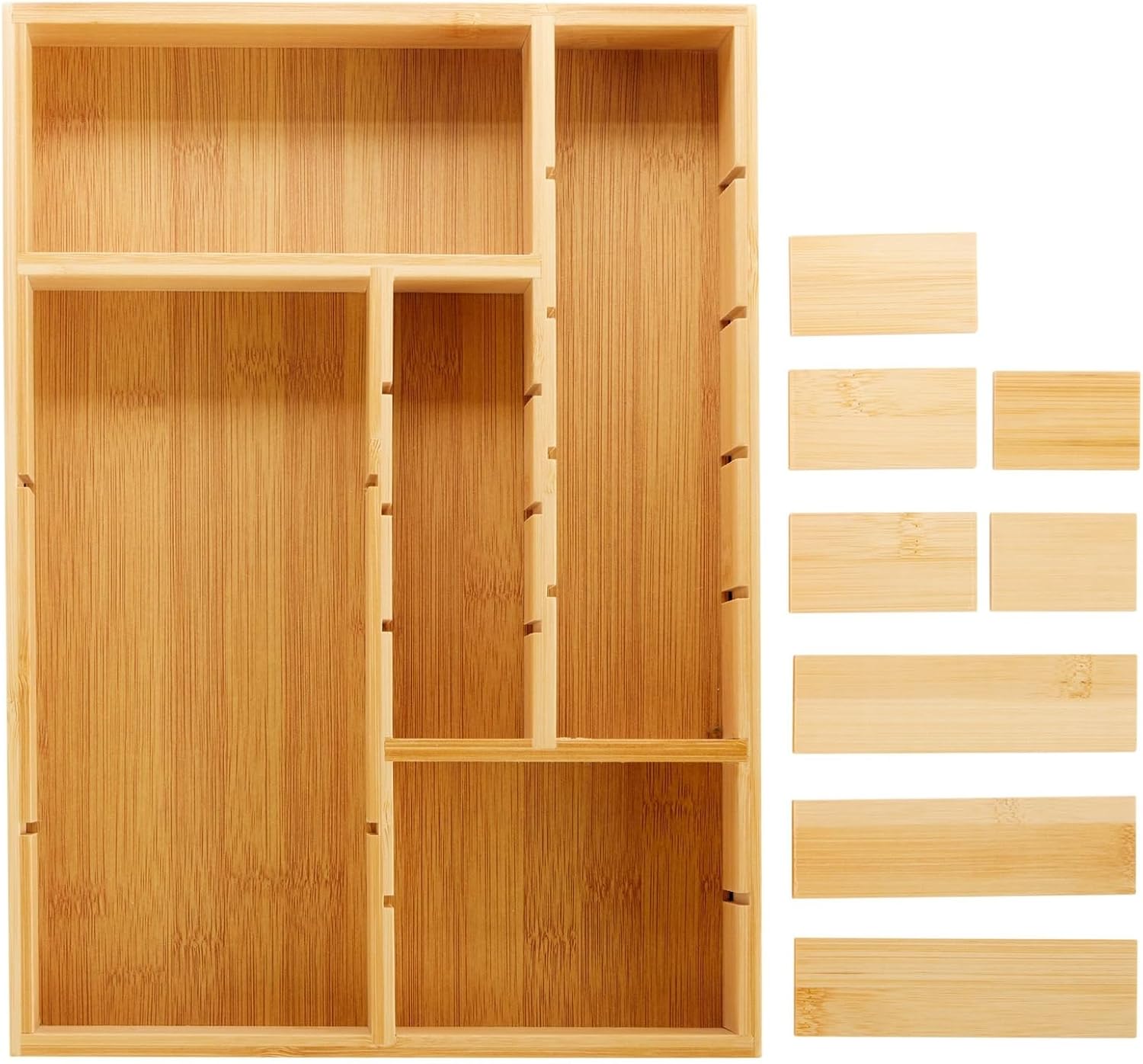 • Customizable Organization: Featuring eight adjustable dividers, this bamboo silverware drawer organizer allows you to tailor compartments according to your needs. Enhance efficiency in your kitchen or office by creating space for utensils, craft supplies, or personal items