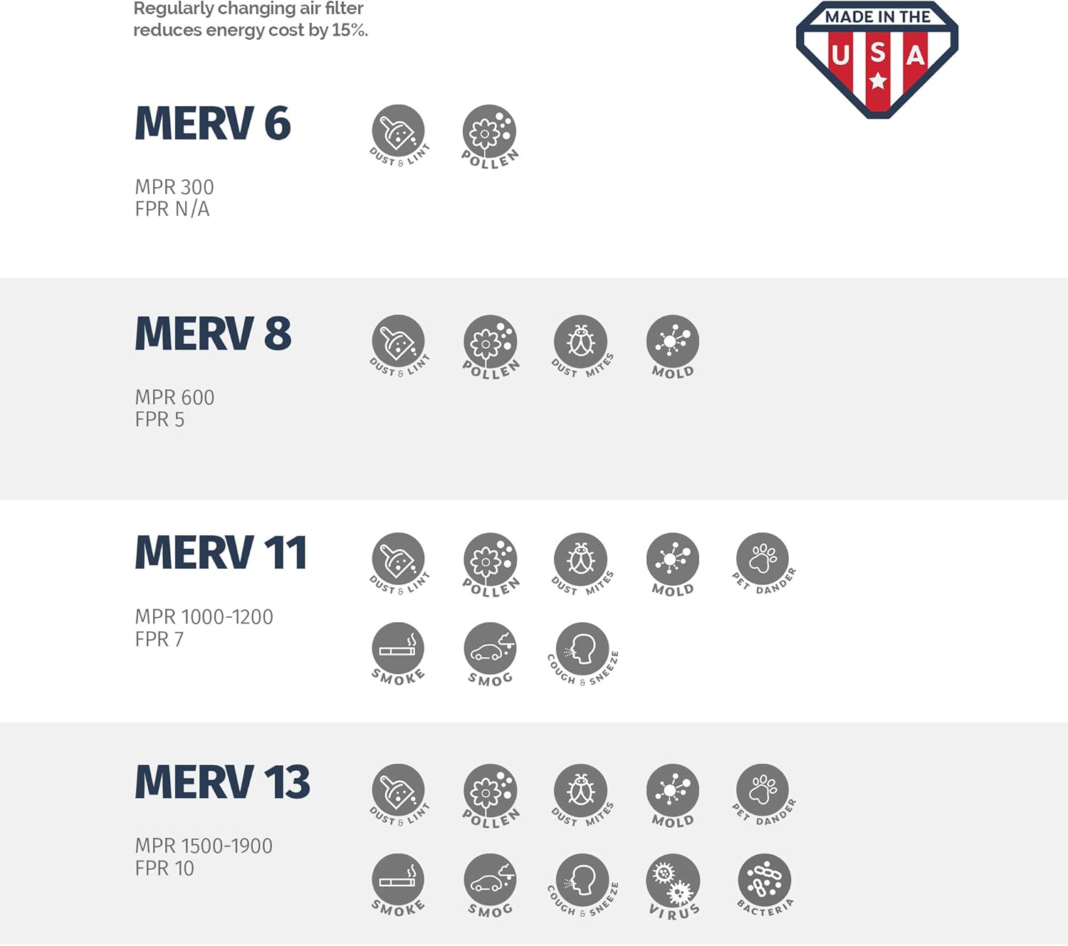 • Comparable to MPR 1000 to 1200 Micro Allergen Defense and Honeywell Allergen Plus FPR 7