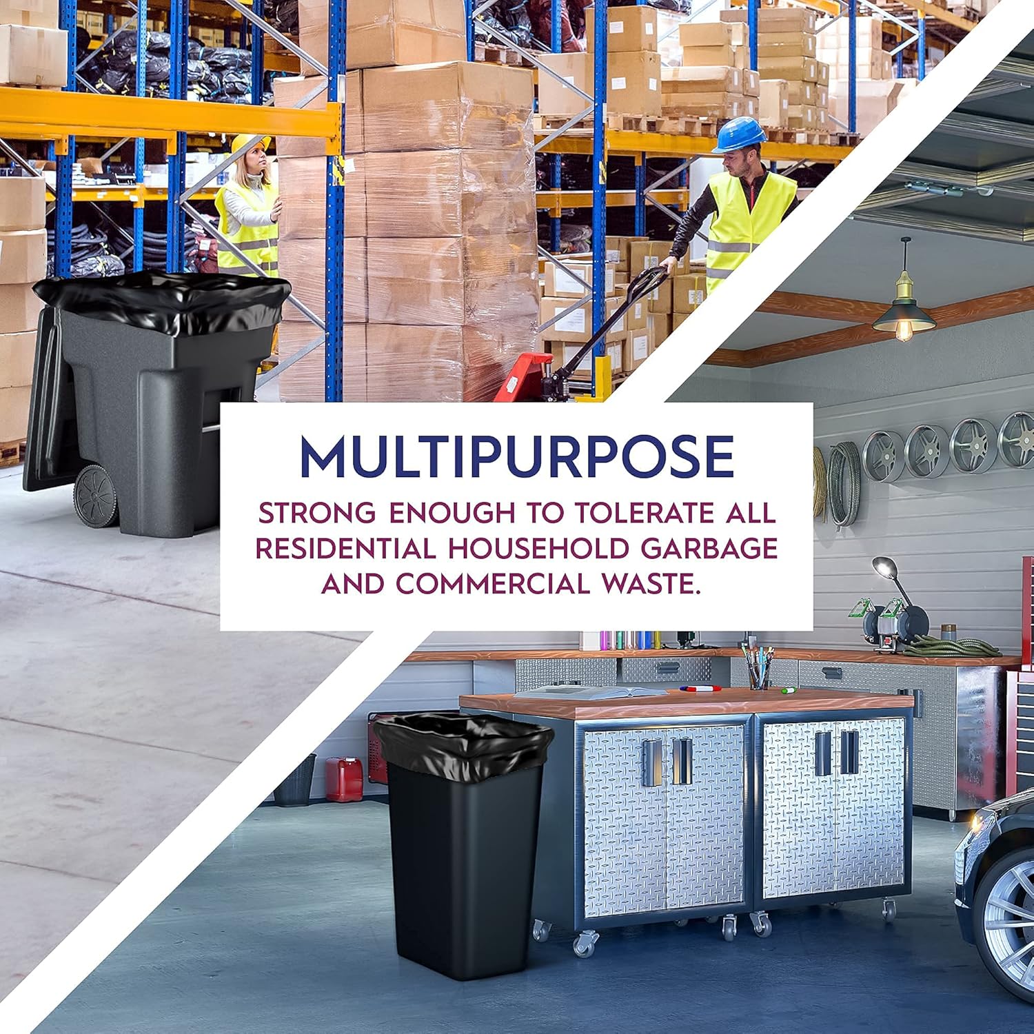 • Multipurpose Garbage Bags for Any Job: These black plastic bags are not only ideal for kitchen and home cleanup, they also provide an affordable alternative to plastic bins. Fill these heavy duty trash bags with lumber, drywall, glass, or freshly trimmed branches without fear of splitting.