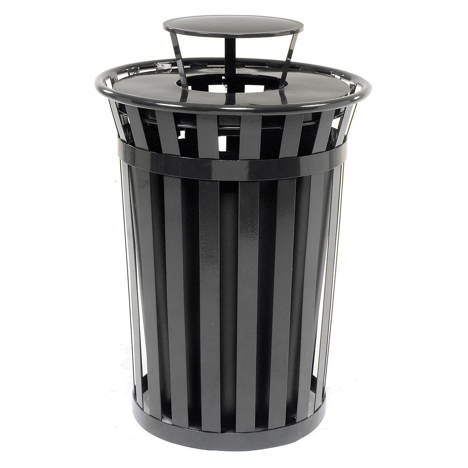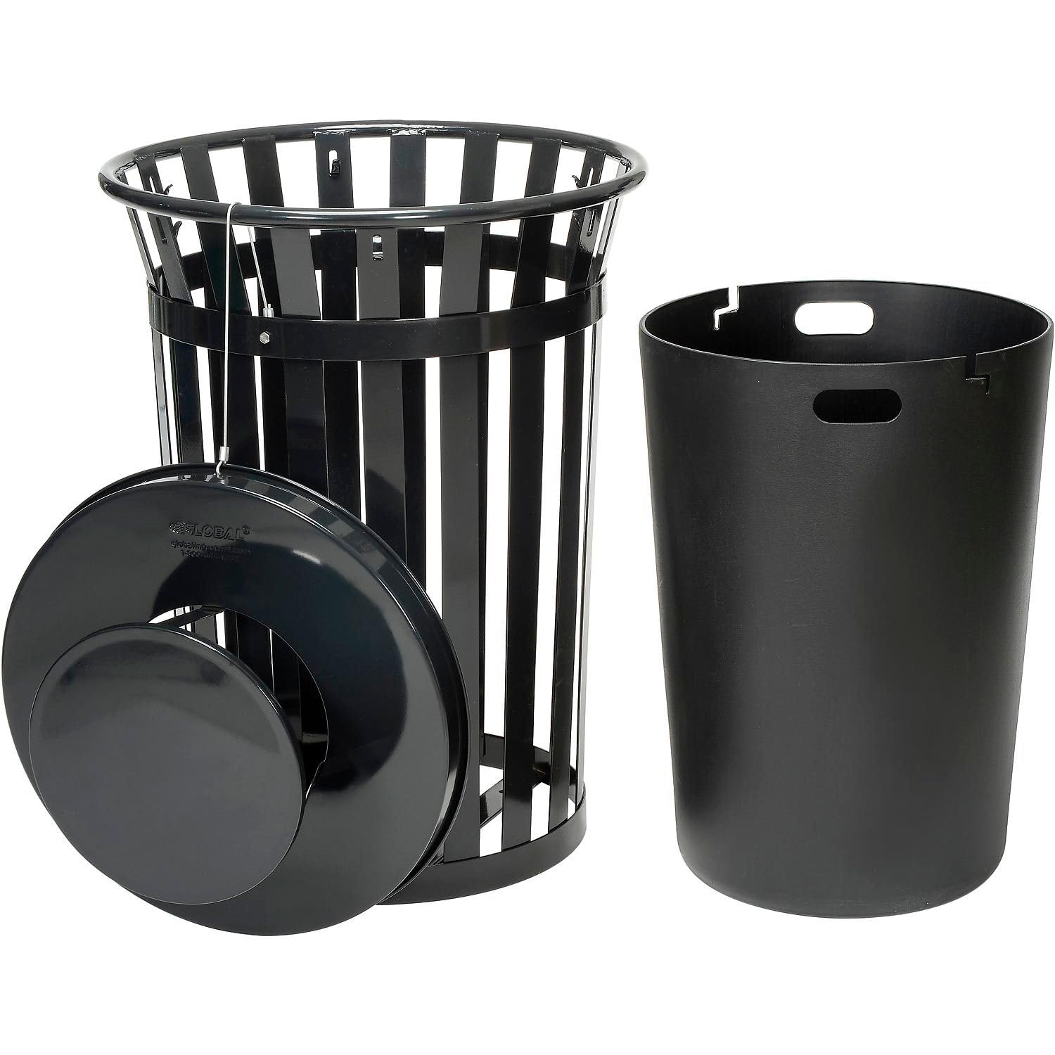 Global Industrial Heavy-Duty 36 Gallon Capacity Outdoor Metal Slatted Trash Receptacle with Rain Bonnet Lid & Plastic Liner, Black, Commercial & Industrial Trash Can