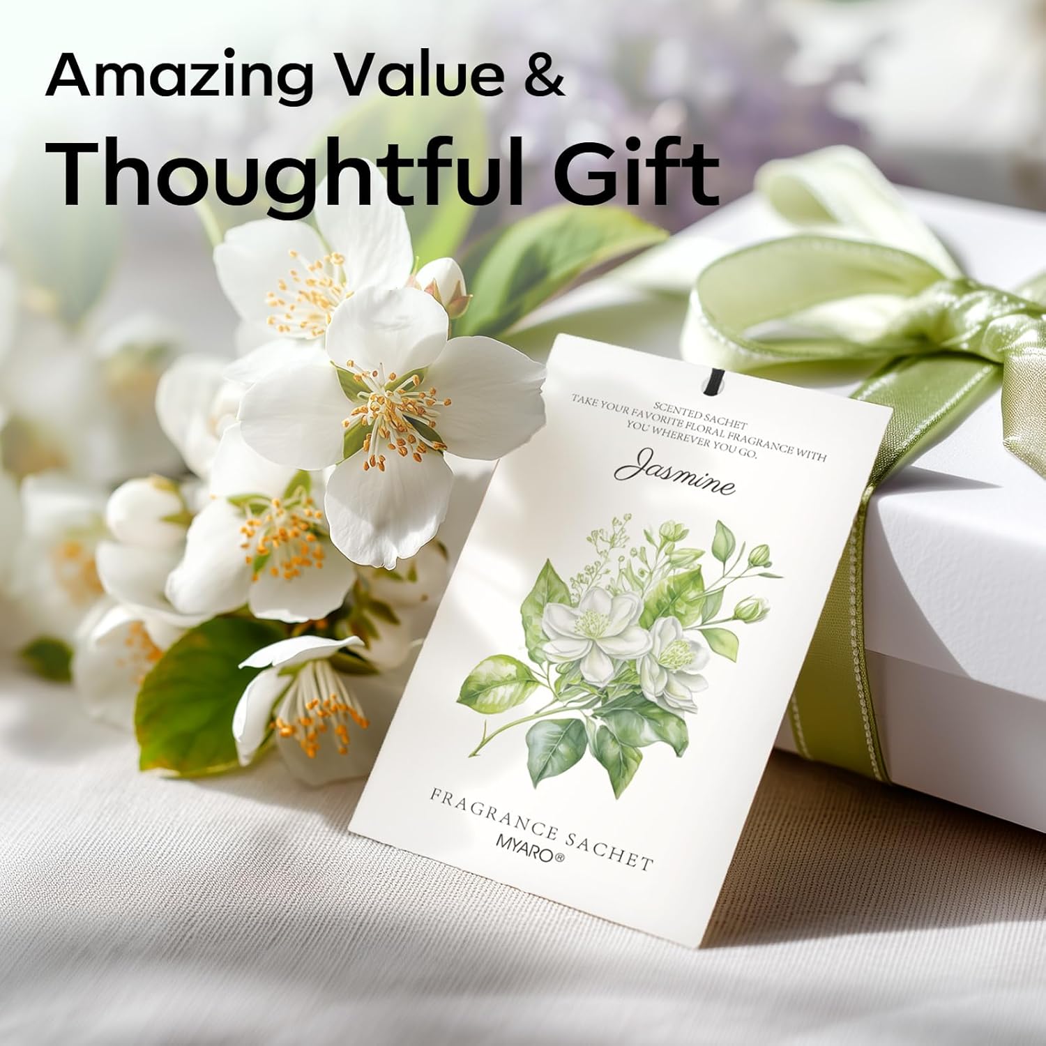 • MYARO Jasmine sachet bags: Includes 12 scented sachets (each bag size: 4.13 inch x 2.76 inch). Our natural fragrance will take you on a journey with the Jasmine fresh scents sachet packets