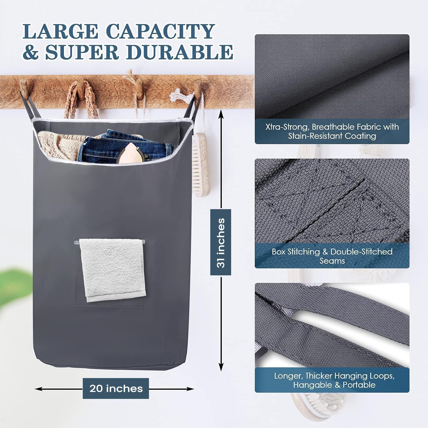• Great Structure & Large Capacity- Size - 20x3.75x31 inches. Our over-the-door laundry hamper is large enough for holding 7-days' worth of dirty clothes. The Wide Open Top allows you to drop a large hanging laundry bag easily. The Higher Back Design and 3.75 inches Side Width allow it to hold even more, making it much wider than most other behind-door laundry hampers.