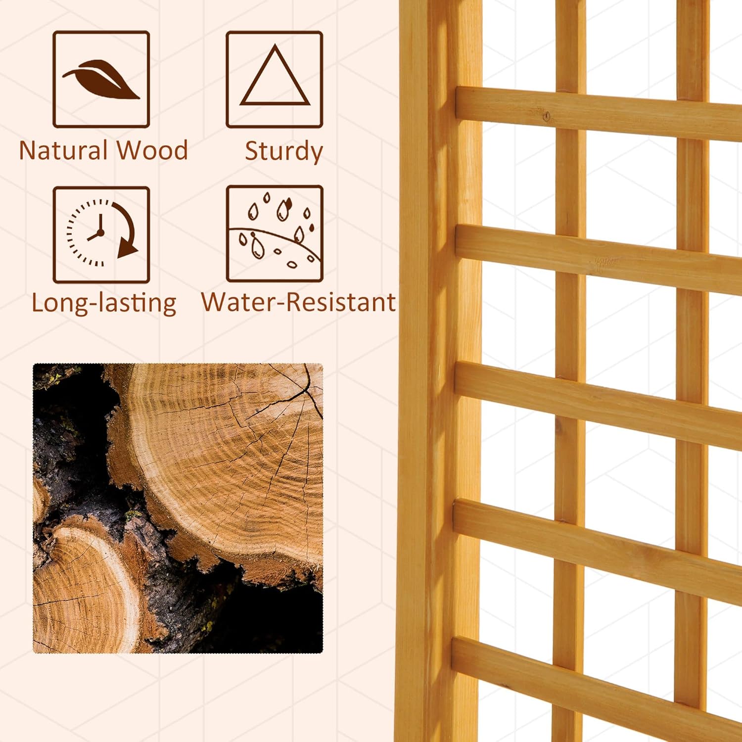 • Durable Construction: Our wood arbor arch is crafted of natural fir wood. This material offers both you and your plants a healthy environment, while the fully sanded posts and panels prevent any undesired injury caused by wood splinters.