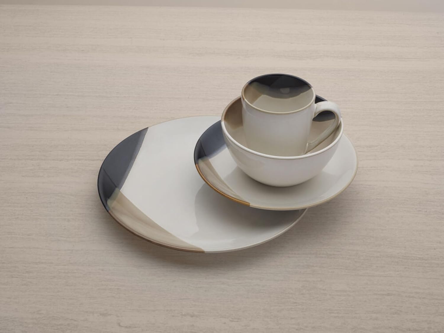 • CONTEMPORARY AND INVITING: Unique black and tan two tone reactive color on product along outside of dinnerware with white glossy center