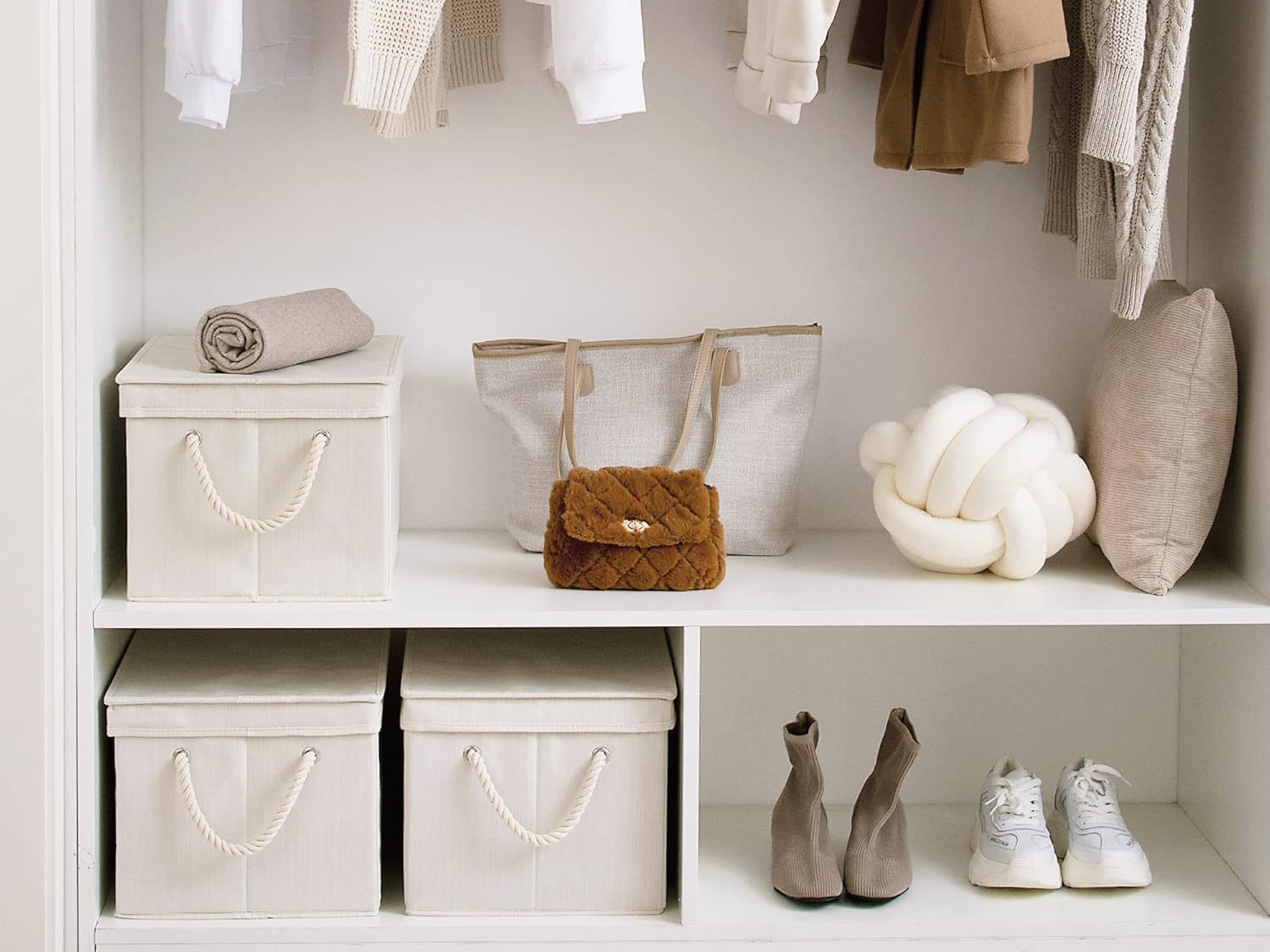 StorageWorks Storage Bins with Lids, Decorative Storage Boxes with Lid and Soft Rope Handles, Foldable Storage Baskets for Closet, Shelves, Stackable, Ivory and White, Jumbo, 3-Pack