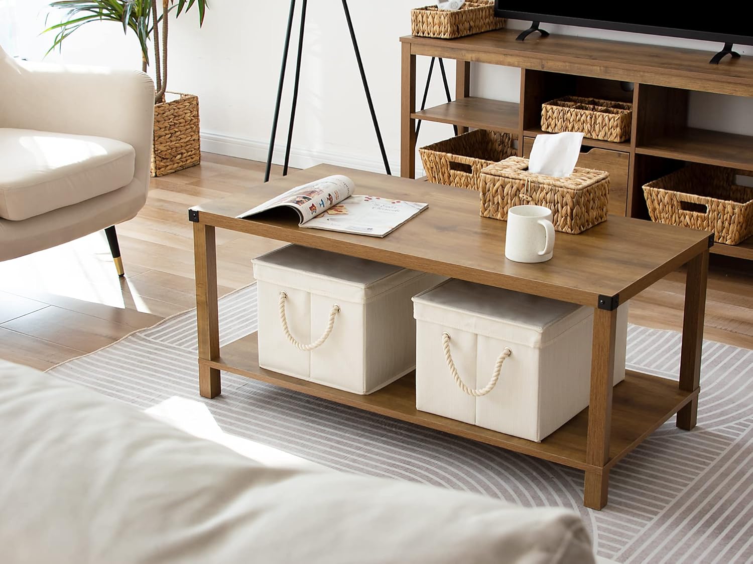 • Thick fabric storage boxes with lids reinforced with heavy-duty boards.