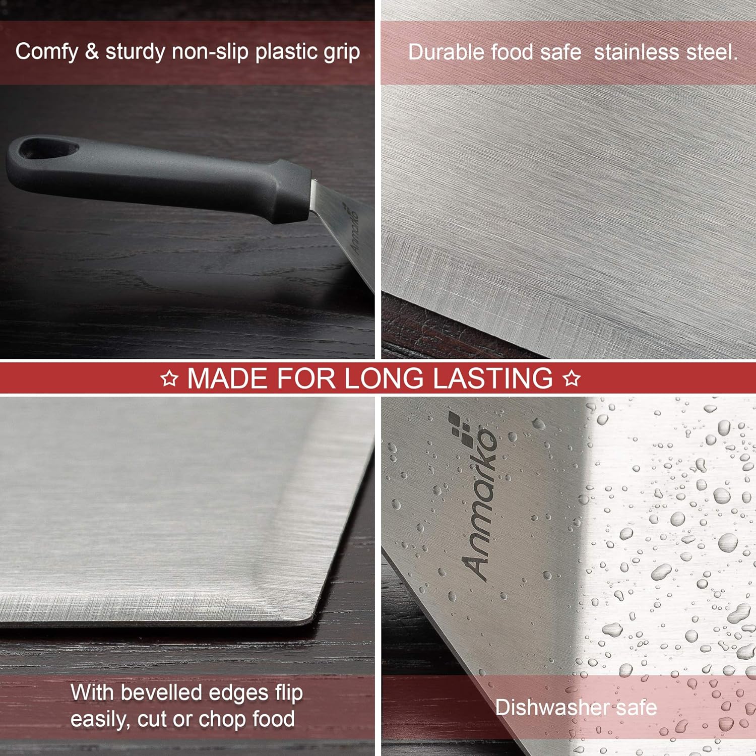 • Heavy duty & sturdy - griddle spatula set​ is tough. The handle securely attached to metal spatula. These ​griddle grill accessories​ are designed to last a lifetime. Stainless steel griddle spatula metal thickness is 1/32 inch