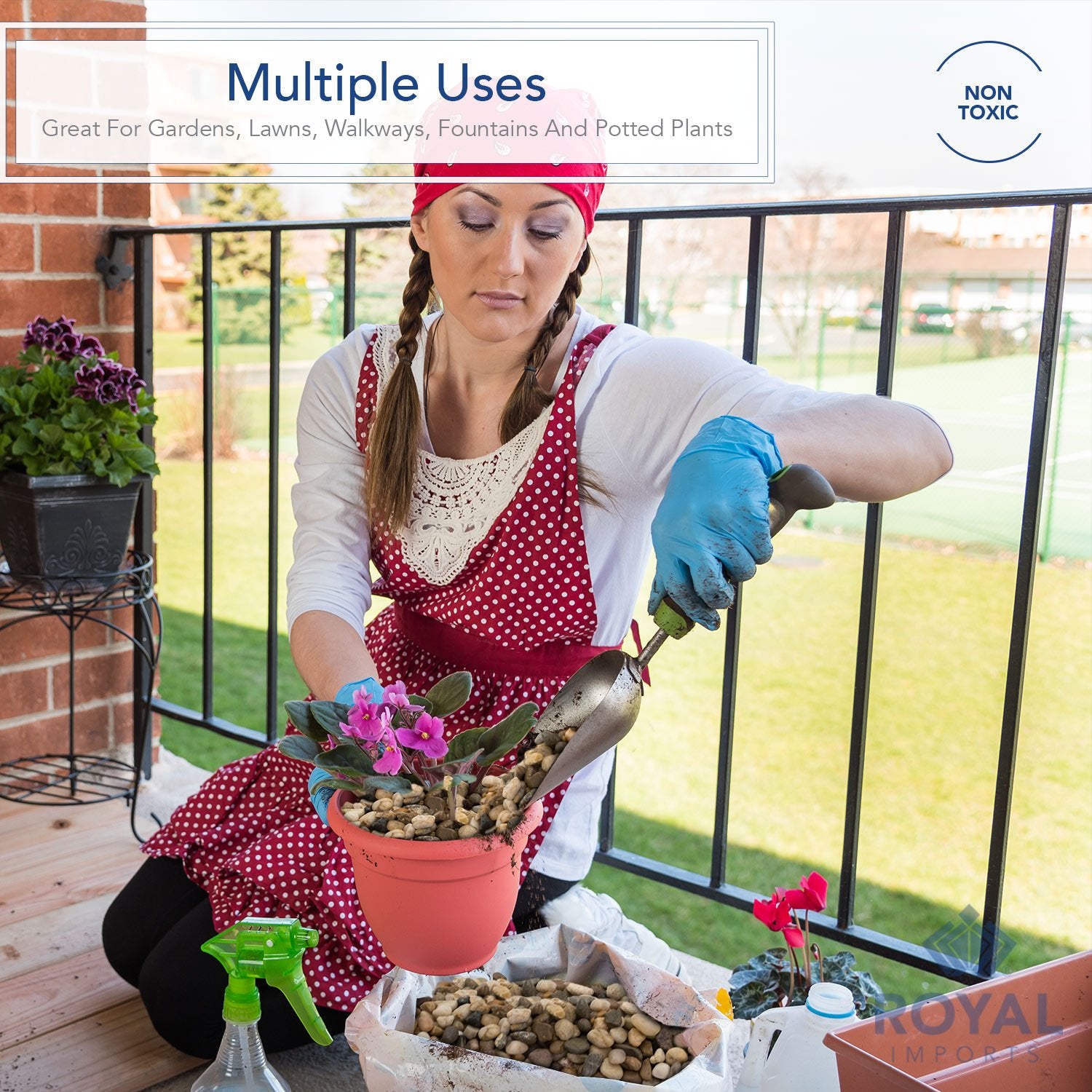 • NATURAL STONES- These high quality natural stones by Royal imports are non-toxic and eco-friendly river rocks. Their natural attribute will make them last longer because they will not deteriorate like mulch does. Common applications include flowerbeds, groundcover, decorative concrete topping, or walkway paving. Decorative rocks are a permanent and cost-effective alternative to annual wood mulching.