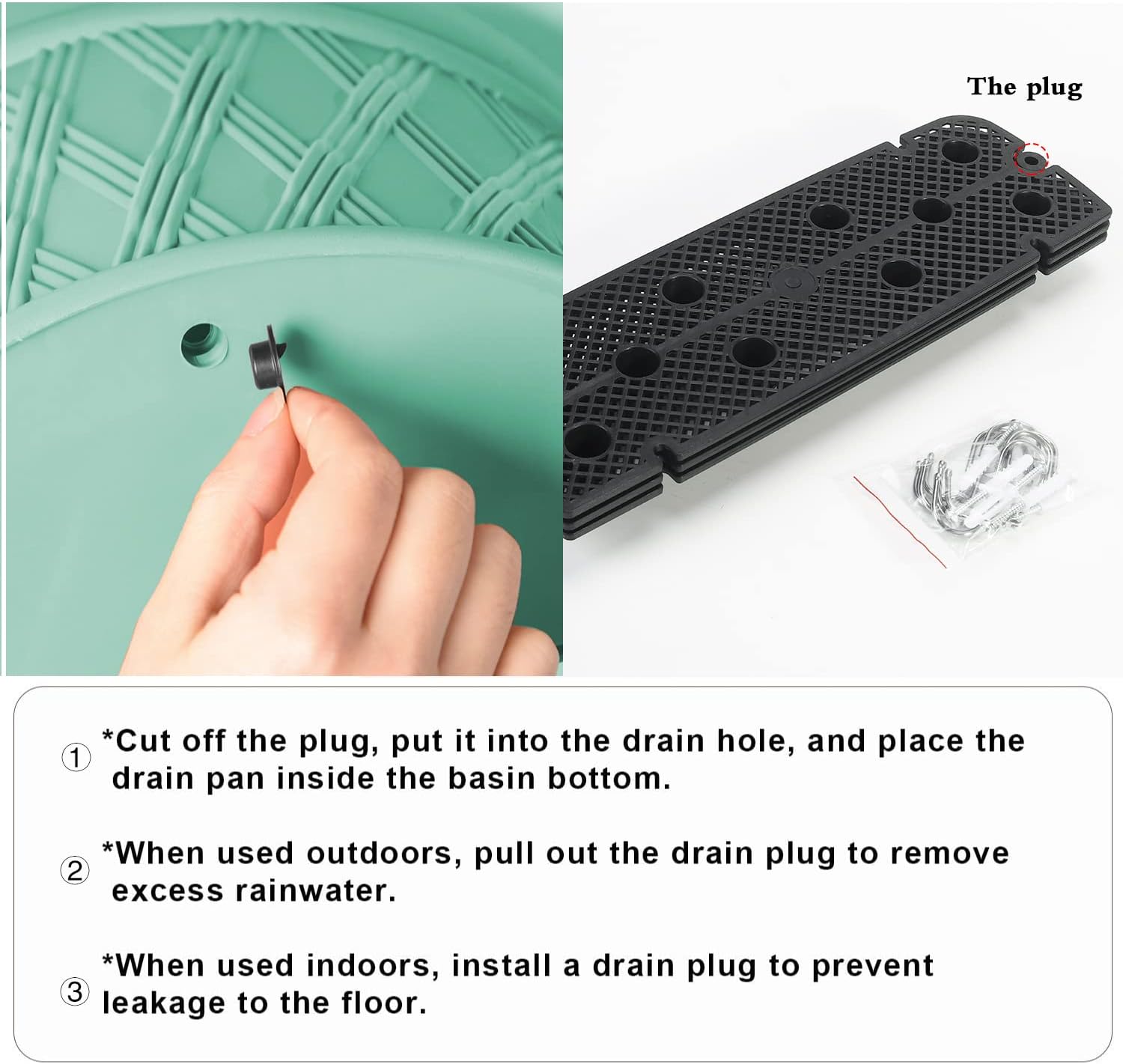• Use instruction: Cut down the plug and put it into the drain hole,then place the drain pan at the pot bottom. Pull out drainage plug to allow for the removal of excess rainwater when installed outdoors. Install drainage plug when used indoors.