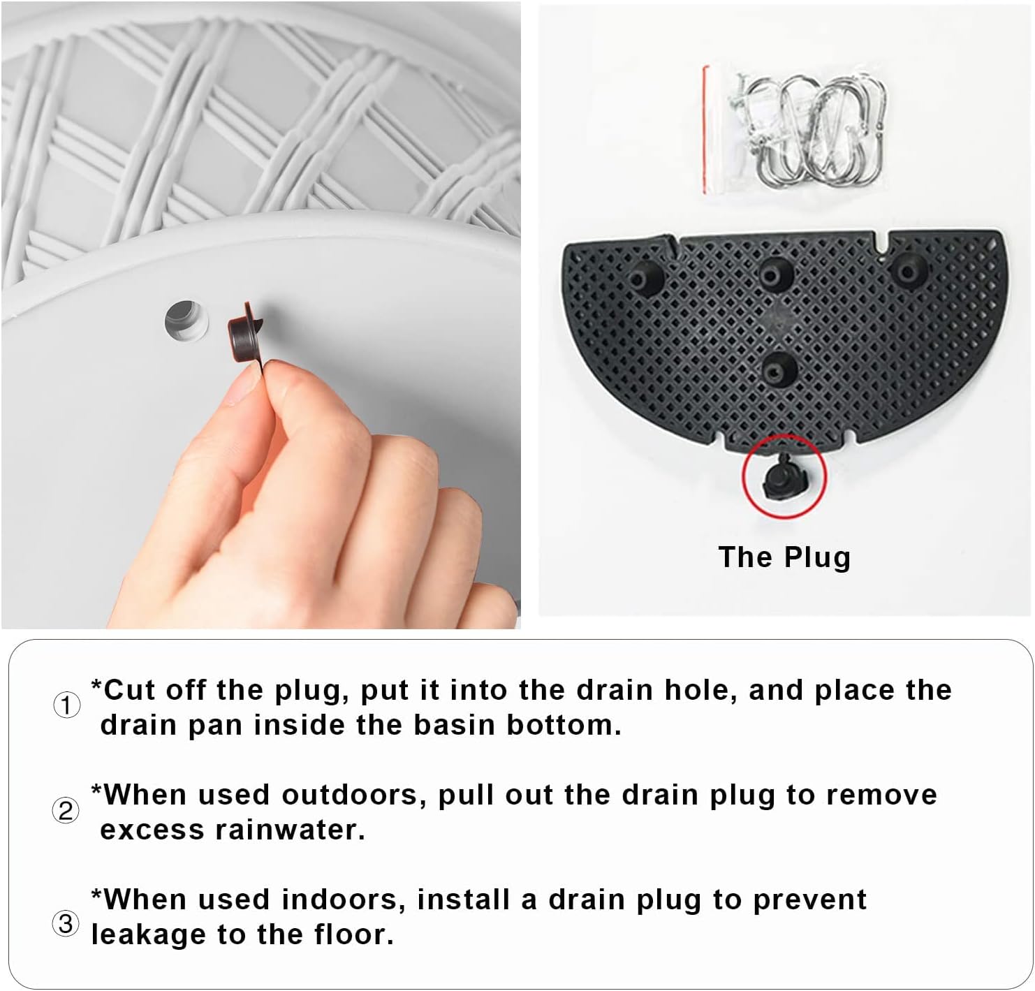• Use instruction: Cut down the plug and put it into the drain hole,then place the drain pan at the pot bottom. Pull out drainage plug to allow for the removal of excess rainwater when installed outdoors. Install drainage plug when used indoors.