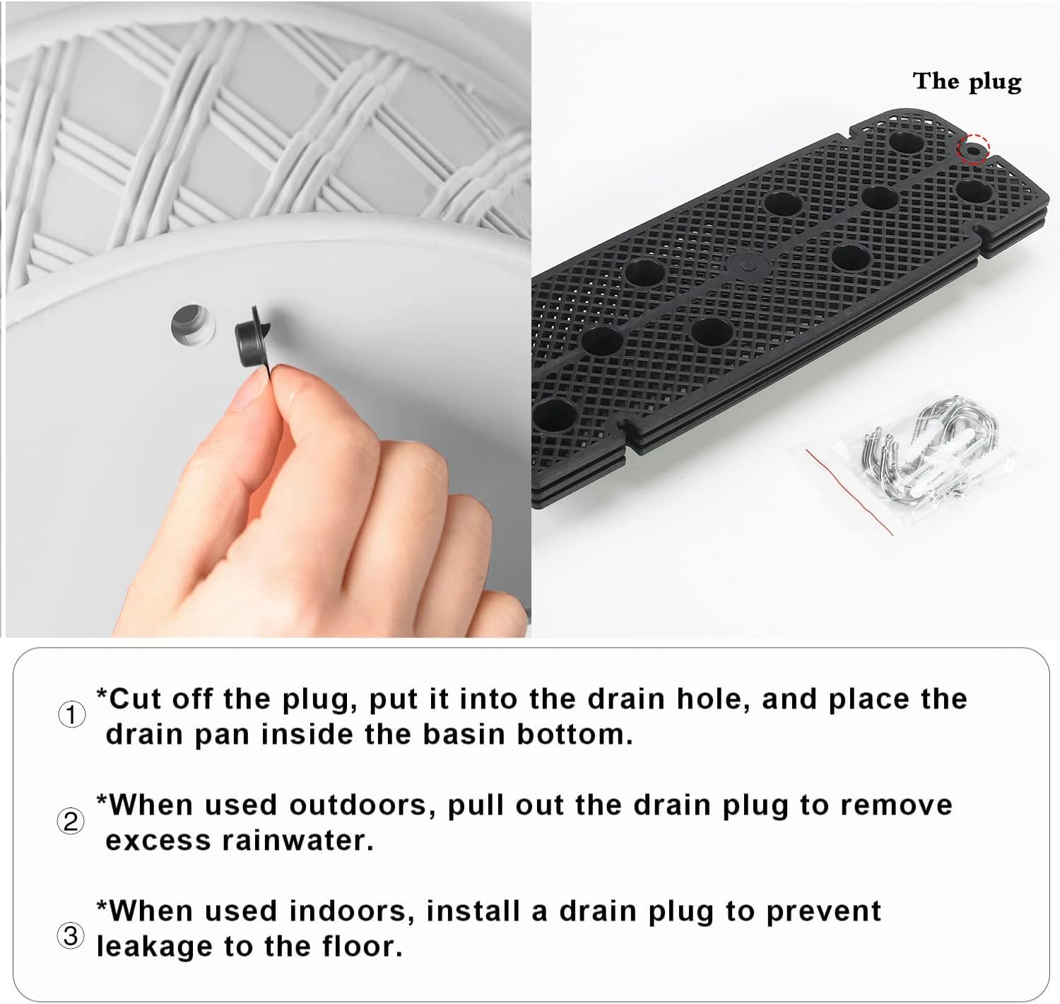 • Use instruction: Cut down the plug and put it into the drain hole,then place the drain pan at the pot bottom. Pull out drainage plug to allow for the removal of excess rainwater when installed outdoors. Install drainage plug when used indoors.