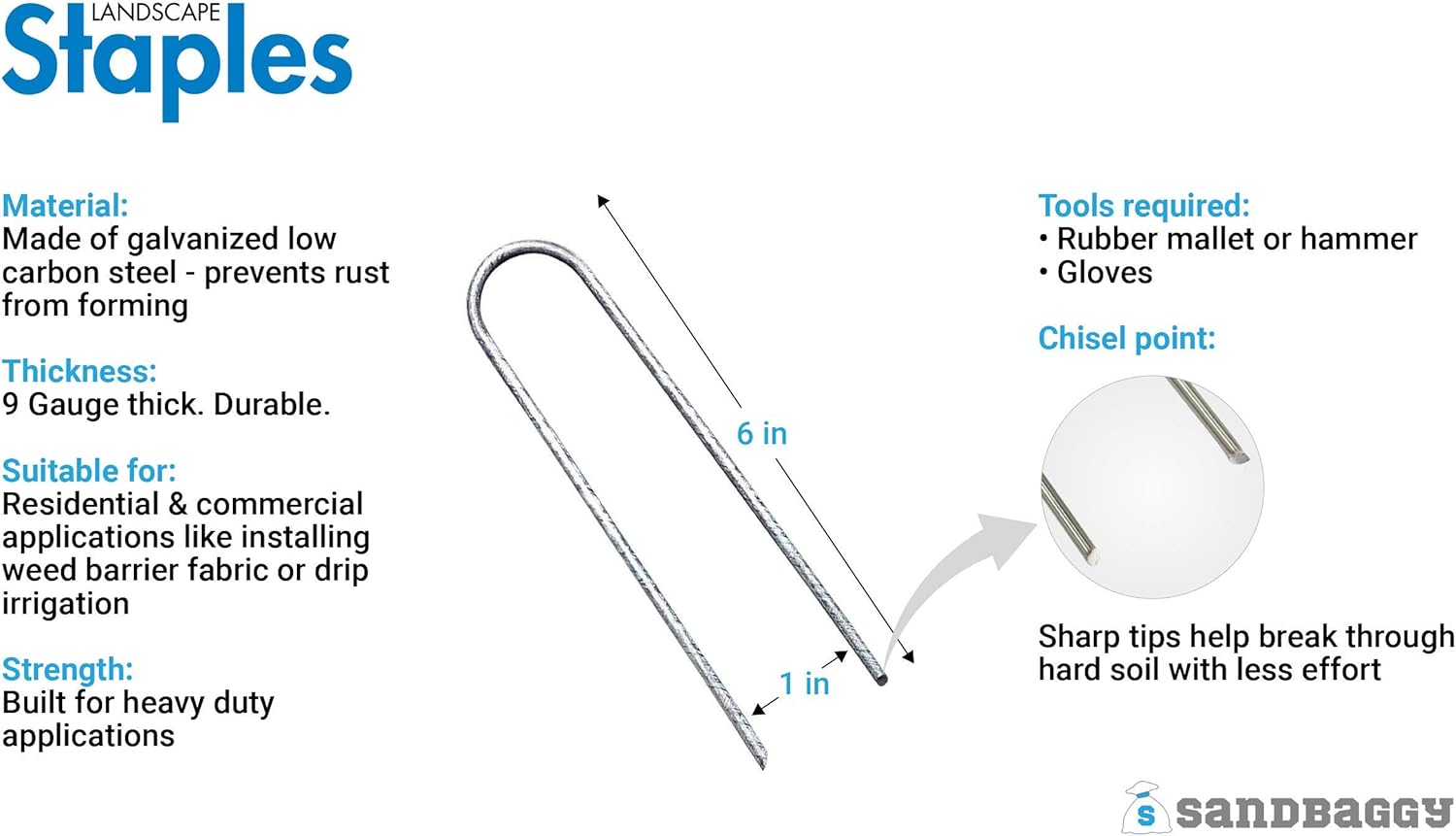 • #1 BEST SELLING BRAND: Sandbaggy landscape staples can be found securing landscape fabric & irrigation piping on job sites, national parks, and airports across America. That’s why we are the #1 best selling brand of landscape staples on the Internet, with over 25 million Sandbaggy landscape staples installed across this great country.