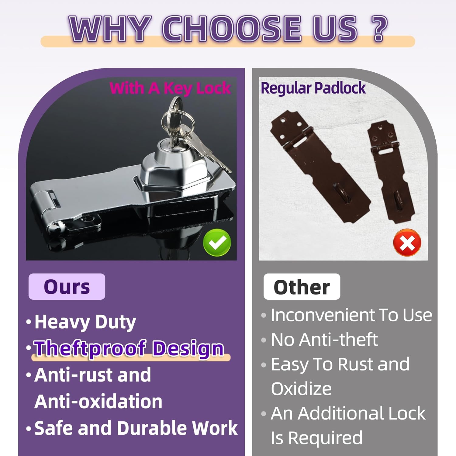 Alise Keyed Hasp Lock,4 Inch Safety Packlock Clasp Hasp Lock Latch with Lock,Door Hinge Lock with Keys Keyed Locking Hasp for Cabinets Closets Doors,Chrome