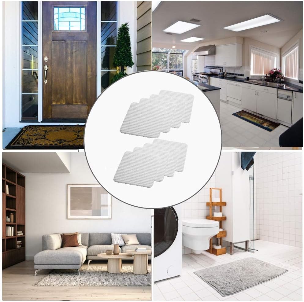 • Components. This package includes 4 pieces. The size of the gripper is 3.9inch x 3.9inch. Each piece is square in order to increase the surface area in contact with the floor. That leaves your kitchen, bathroom, and hallway much more secure. You can even use them outdoors to prevent slipping and flatten corners.