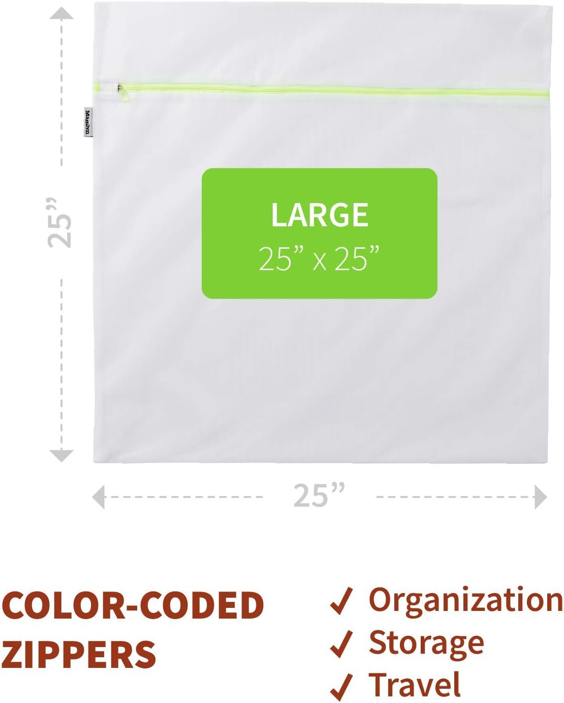 • DIMENSIONS & FEATURES: With small (15" x 12"), medium (20" x 16"), and large (25" x 25") sizes to choose from, you'll find a set or single bag suitable for you. Made of lightweight 100% polyester, these mesh bags are dryer safe. The color-coded zippers also make them great for organizing.