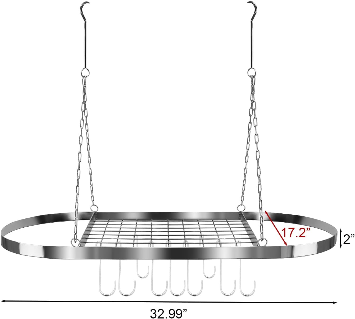 • EASY TO ASSEMBLE — Minimal assembly required with quick set-up — Package includes grid rack with 2 hanging chains, 10 pot hooks, and mounting hardware — Made of metal with powder-coated finish — Beautiful oval frame for stylish look — Complements most light fixtures, appliances, cookware, and design interiors — Measures approximately 31.50" L X 16.50" W X 21" H