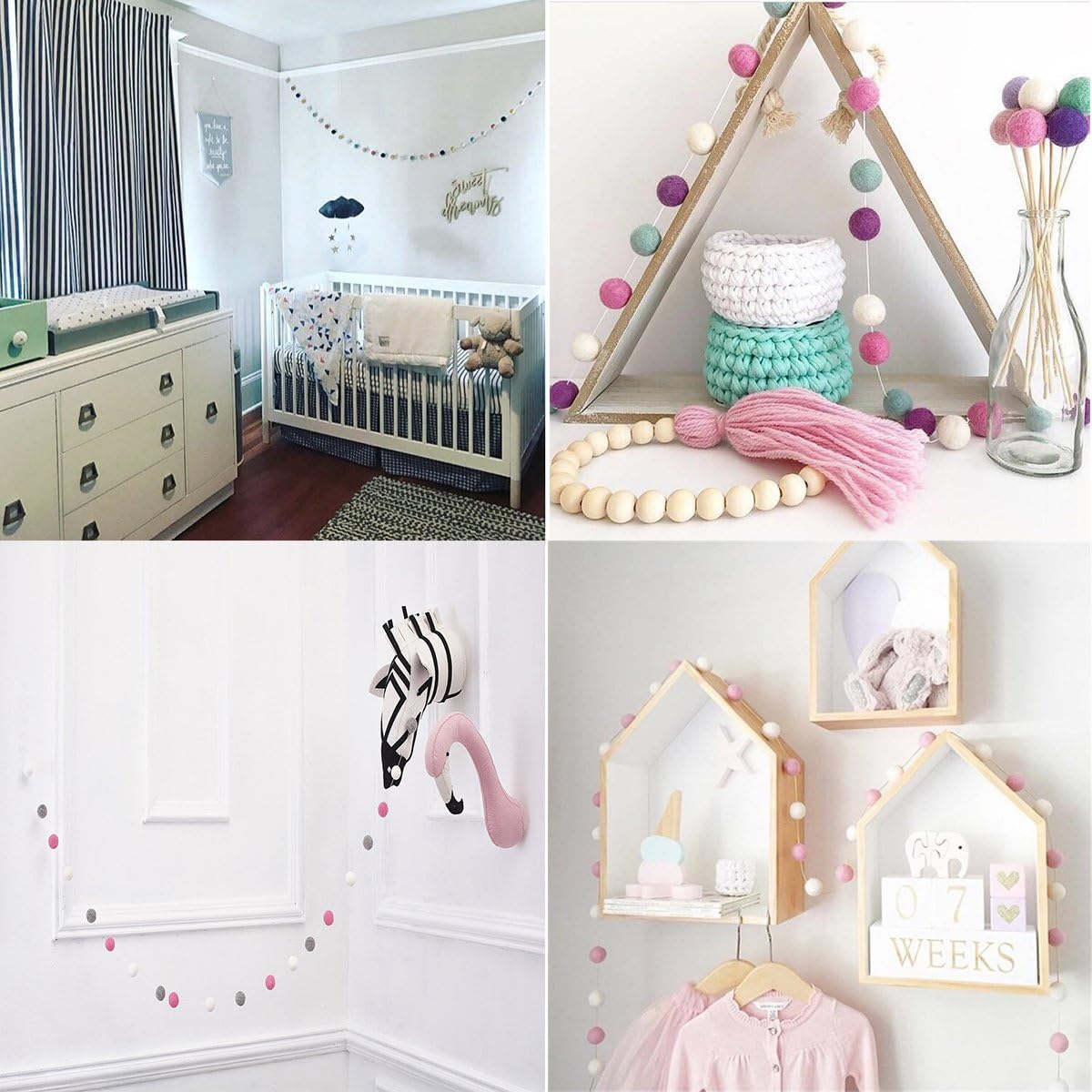 • Pom Pom Garland: This garland is made with 20mm felt balls. 35 balls are hand-stitched to the string. ▶▶Balls are NOT in fixed position in the garland.