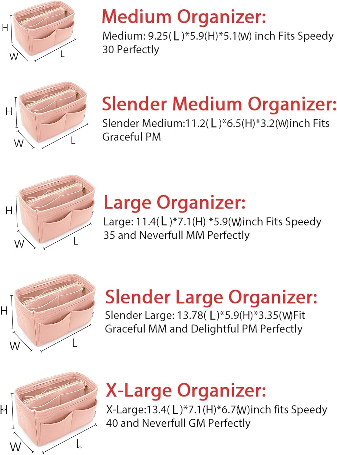 • SIZE OF BAG ORGANIZER: Medium: 9.25(L)*5.9(H)*5.1(W) inch Fits Speedy 30 Perfectly. Slender Medium: 11.2(L)*6.5(H)*3.2(W)inch Fits Graceful PM. Large: 11.4(L)*7.1(H) *5.9(W)inch Fits Speedy 35 and Neverfull MM Perfectly. Slender Large: 13.78(L)*5.9(H)*3.35(W)Fit Graceful MM and Delightful PM Perfectly. X-Large:13.4(L)*7.1(H)*6.7(W)inch fits Speedy 40 and Neverfull GM Perfectly. Portable and Compact Purse Perfectly For any Brand.L*H*W means (Length*Height*Width)