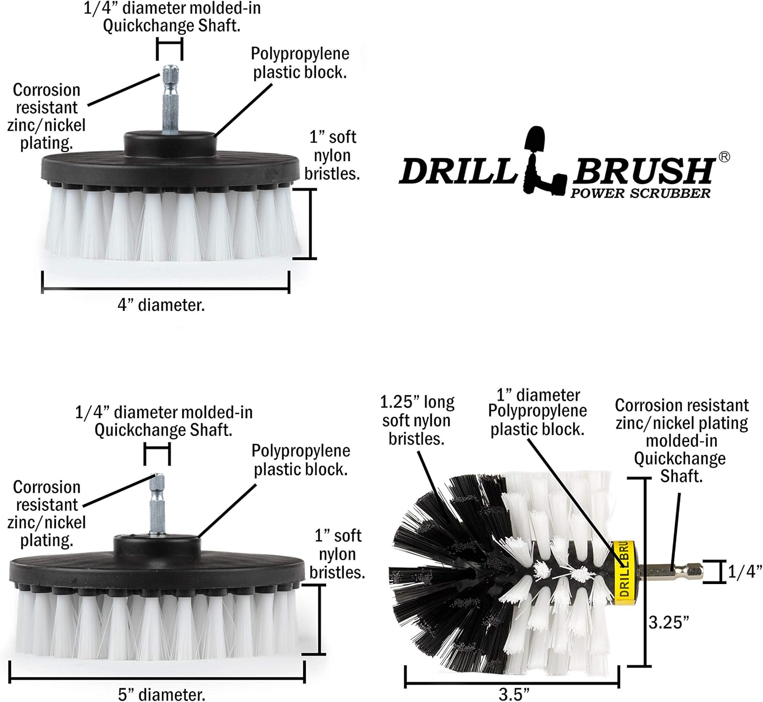 • Included: The Original Drillbrush Power Scrubber in soft white, a MINI Original, a 5-inch diameter, a 4-inch diameter, 2-inch diameter short bristle, and a 2-inch long bristle brush (all in soft white). All brushes in this cleaning drill brush set feature rugged steel shafts with quarter inch quick change ends, allowing use with half-inch drills, three-eighths drills, AND quick-change drivers. Includes multiple sizes of power scrubbing brush so you always have the right tool for the job.