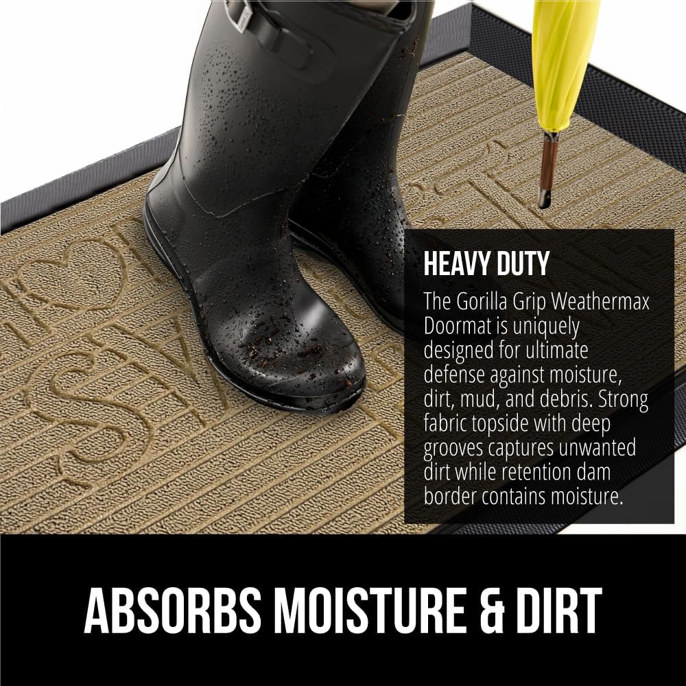 • THE ORIGINAL WEATHERMAX ALL SEASON DOORMAT: Gorilla Grip's Original WeatherMax doormat is built tough with a heavy duty, yet soft and flexible construction; deep grooves, beveled rubber border and retention dam help capture dirt, debris and moisture