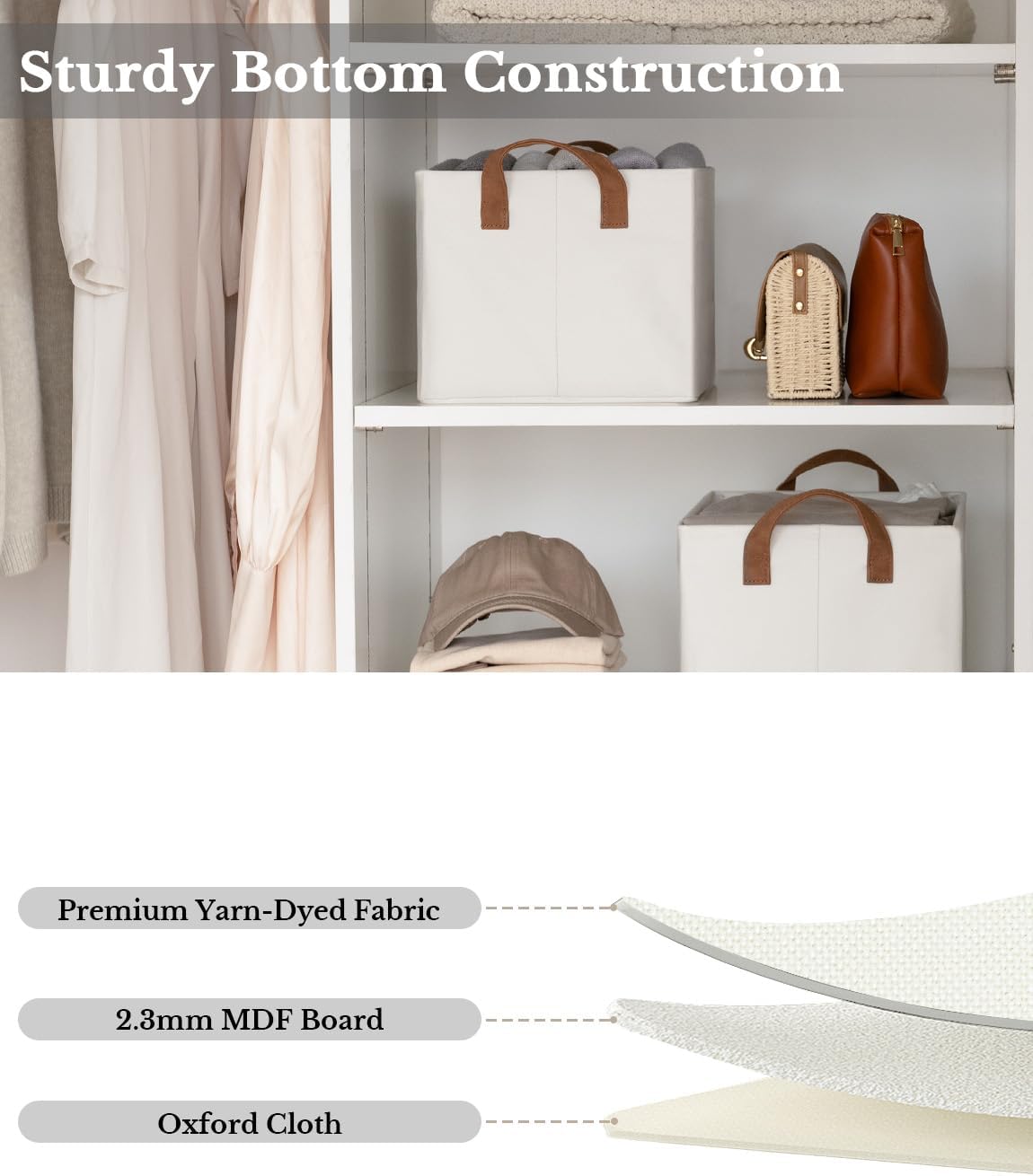 • Premium Quality: Made from high-quality fabric and reinforced with a heavy-duty MDF bottom board and a sturdy metal frame. The solid construction enables the storage bins to stand upright without support, even when empty.