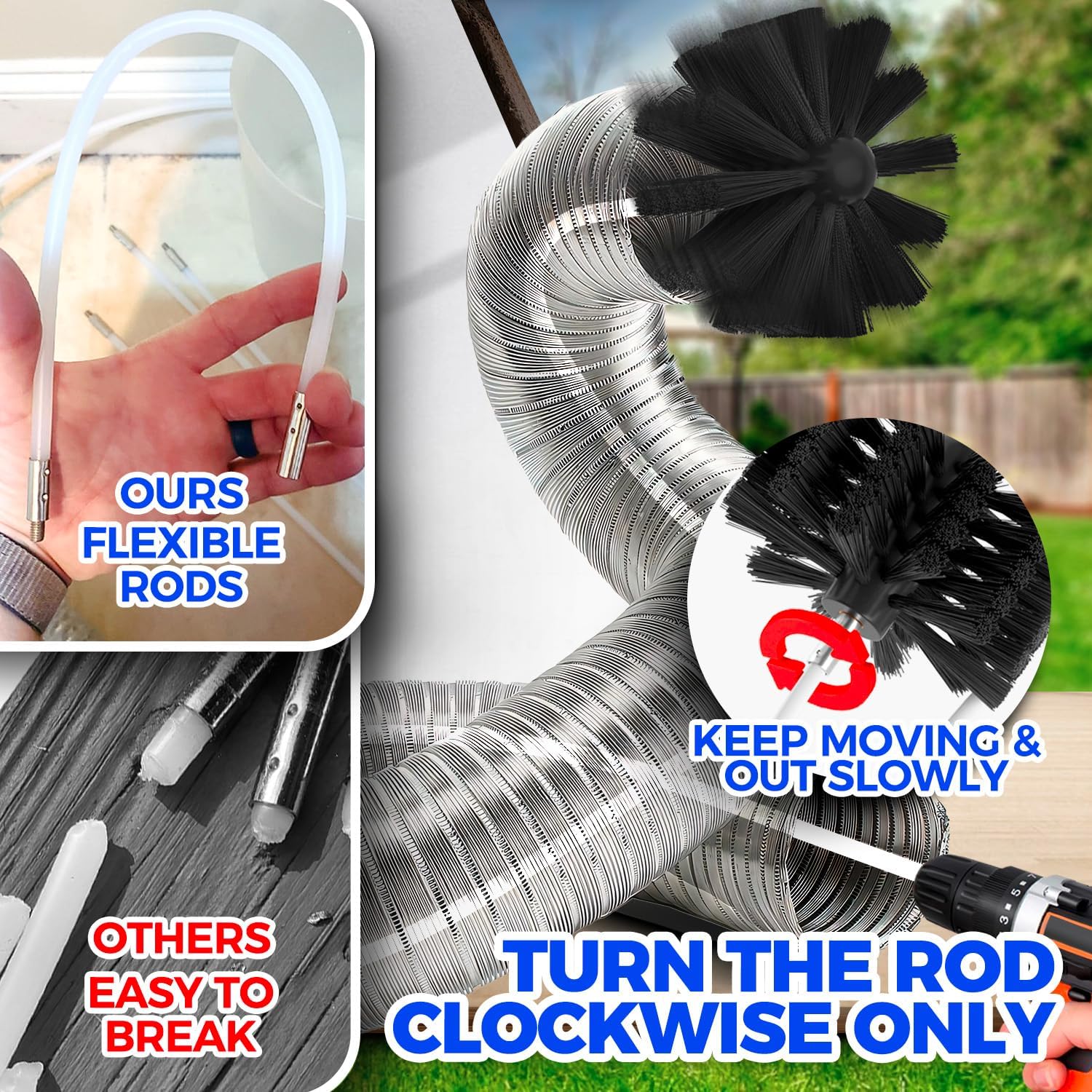 • DRYER VENT CLEANING BRUSH: Dryer vent cleaner kit can be used with or without any kind of power drill and will help you achieve professional results; Just always turn the rod clockwise and keep moving in&out slowly; Kindly remind that while cleaning around corners and turns or stubborn lint trap, slow down and then accelerate slowly