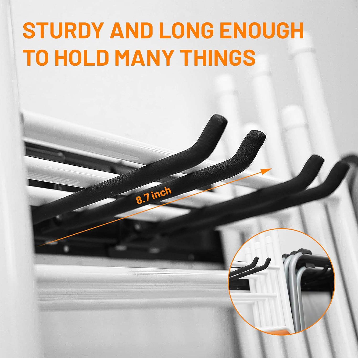 • ADJUSTABLE STORAGE SOLUTION— The best part of the garage storage system is that the hooks can snap on the rail and move around on it to meet your actual needs