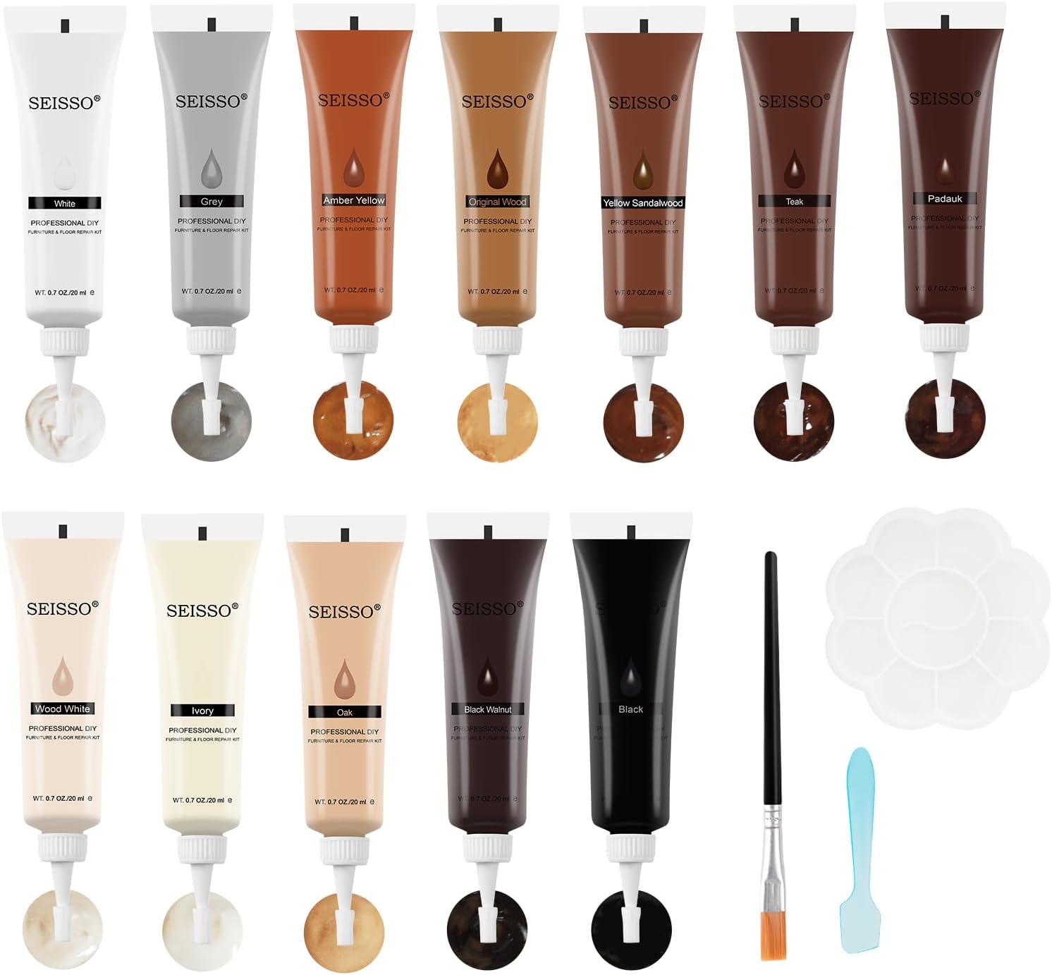 SEISSO Furniture Repair Kit, 12 Colors Wood Touch up Paint, Wood Stain, Wood Filles, Wood Paint Restore Any Wooden Floors, Cabinet, Tables, Carpenters, fix furniture Scratches, Cracks, Hole