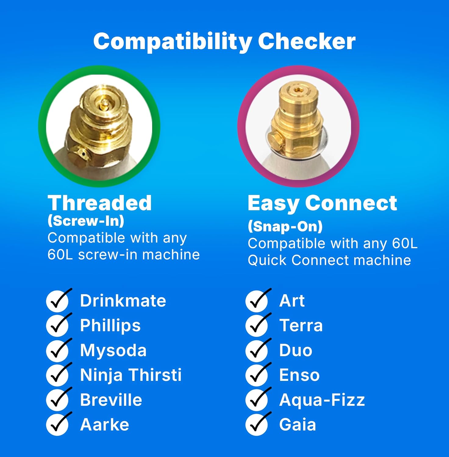 • [Canister Compatibility] We don't mind if you call it a canister, cylinder, tank, or cartridge! Just remember that our green capped, threaded canisters are compatible with screw-in connector soda and sparkling water makers, including SodaStream, Aarke, Philips, and Ninja Thirsti. If you have a SodaStream ART, TERRA, DUO, or other quick connect machine, you will need to purchase our pink capped, Easy Connect canisters.