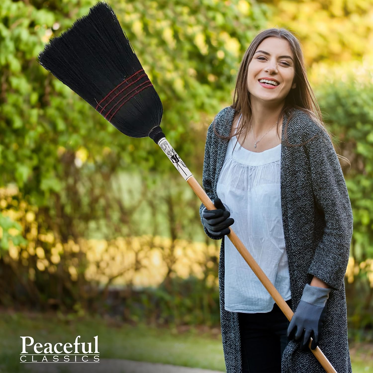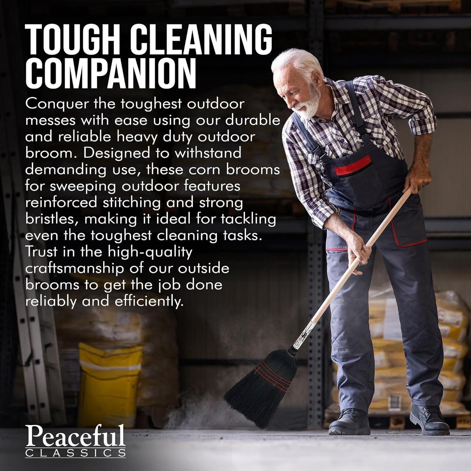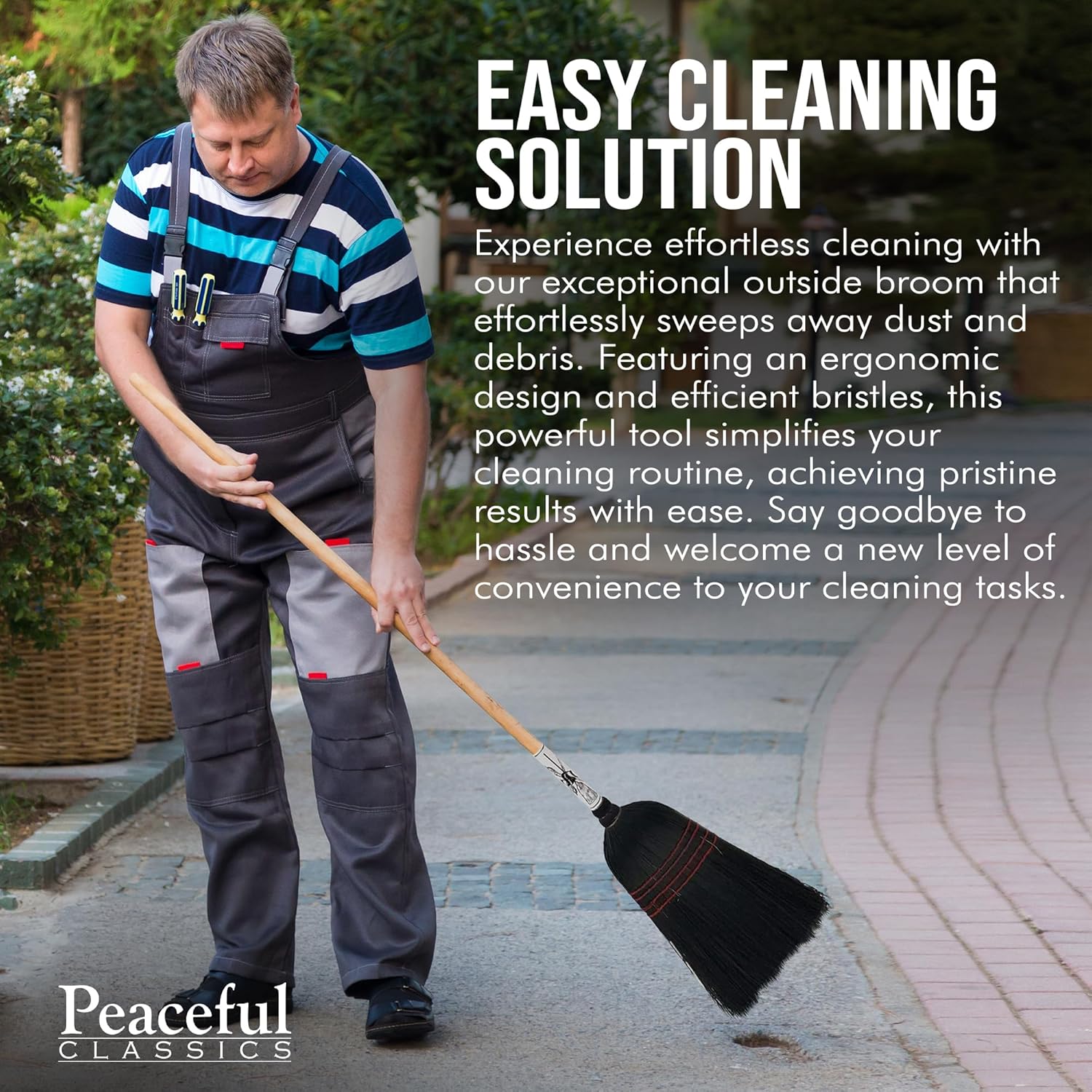 • GREAT SIZE: Peaceful Classics indoor and outdoor broom is sized perfectly with dimensions of 57” long, along with a broom head 19" long and 12" inches wide. The wood broom handle is 1 ¼” thick. Use the wooden broom stick with ease and take the hassle and frustration out of cleaning!