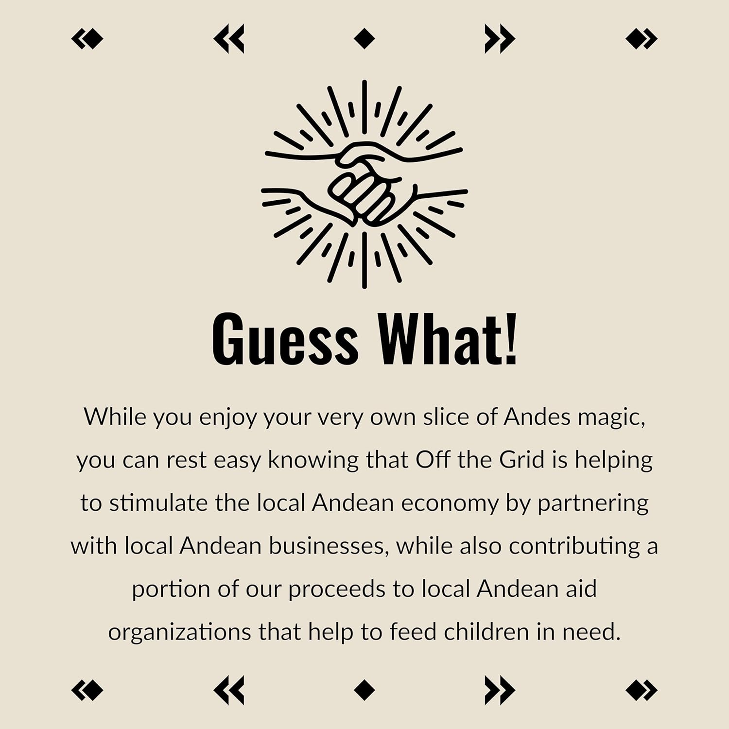 • SOCIALLY RESPONSIBLE: While you enjoy your very own slice of Indian Andes magic, you can rest easy knowing that Off the Grid is helping to stimulate the local Andean economy by partnering with native Andean businesses, while also contributing a portion of our proceeds to local Andean aid organizations that help to feed children in need.