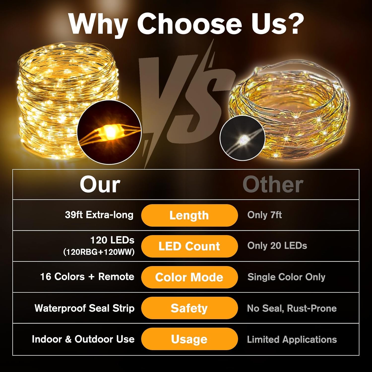 • 【39Ft, 120 Led, 16 Vibrant colors】Compared to other single color fairy lights on the market, we made it 39 ft with 120 Leds, 16 colors, which is more useful and cost-effective. Use the remote control or press the button on the battery case to switch different colors like warm white, red, green, blue, orange, purple etc to create ideal ambience in special events and occasions. LED Bulb Size: 8.55mm*5.0mm