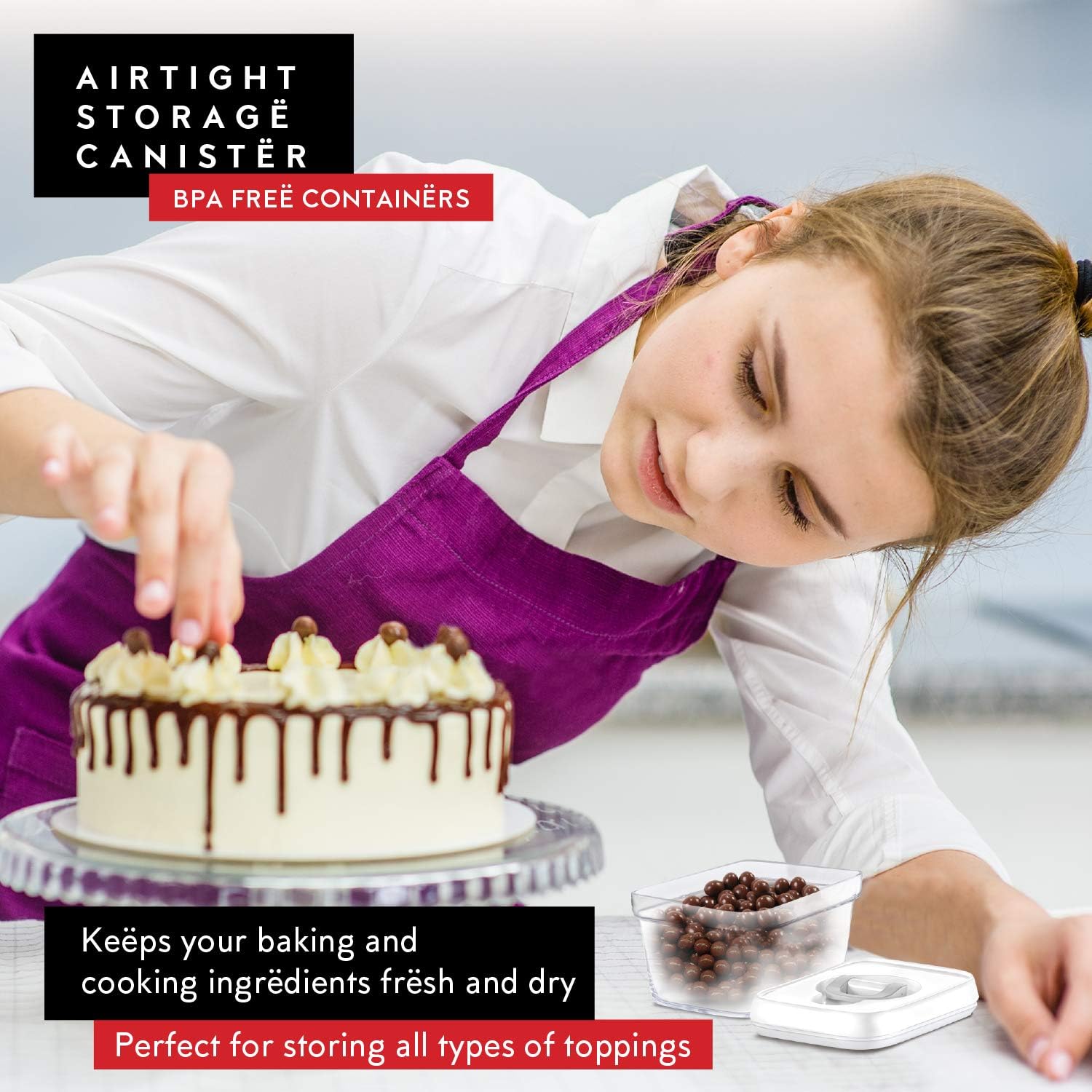 • 6 Small Food Storage Containers: This kitchen organization set includes 6 small air-tight containers that are all the same size. Each one has a 0.38 liter capacity (1.4 cups), measures 5.2” L x 3.8” W x 3.2” H, great for storing everything with a small amount from Chocolate, candy, nuts, dried fruit, coffee, tea, Splenda, to smaller servings of sugar.