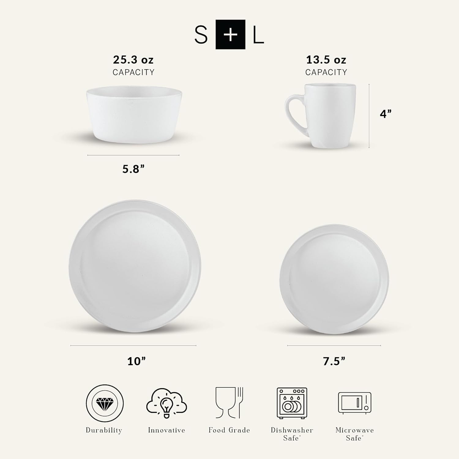 • 16-piece dinnerware service for 4 includes 10" dinner plates, 7.5" salad plates, 5.75" bowls, and 12.5 oz mugs—everything needed for casual dining or elevated hosting.