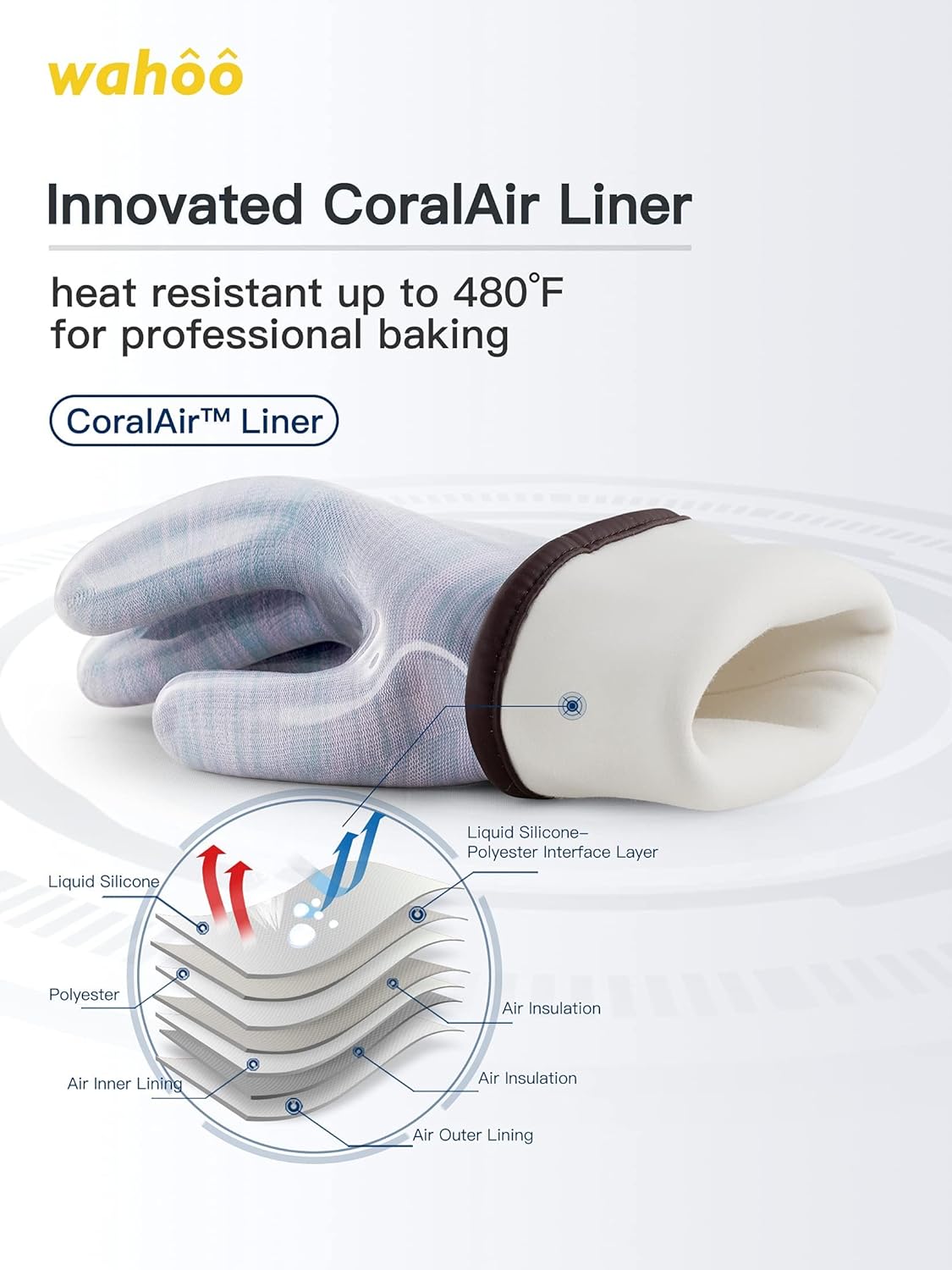 • Seamless Coralair Liner - With 18 gauge seamless CoralAir liner, these grill gloves are breathable, dexterous and pliable, easy to pull on and off, keeping hands cool and free from sweat. And these liquid silicone gloves with separate fingers provide high dexterity and superior grip on grabbing the greasy food and slippery plates.