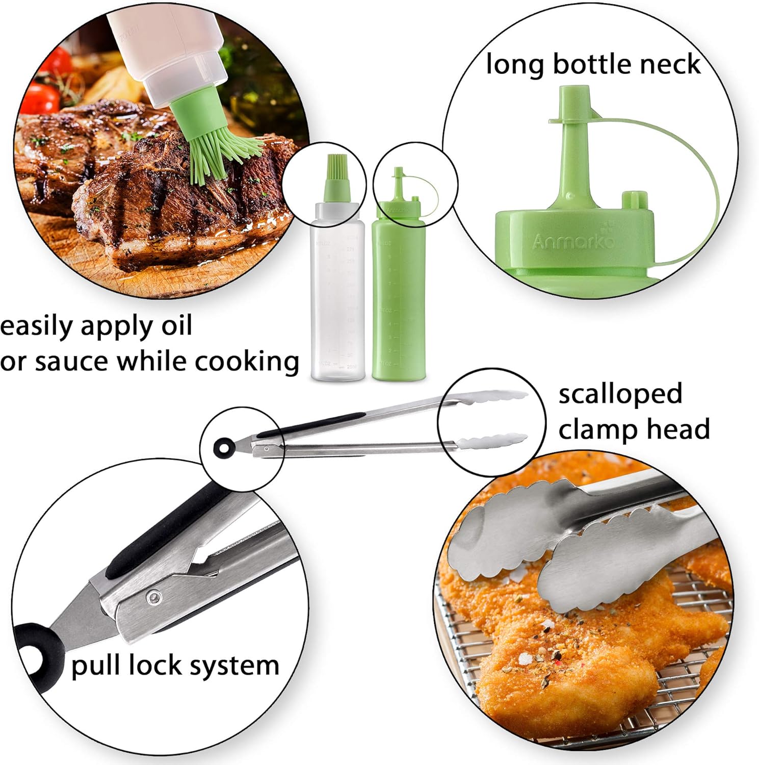 • Professional Stainless steel spatula set - includes 1 x cooking spatula turner, 1 x grill spatula, 1 x hamburger turner 4 x 8 inch, 1 x griddle scraper, 1 x grill tongs, 2 x squeeze bottles with silicone brush lid.