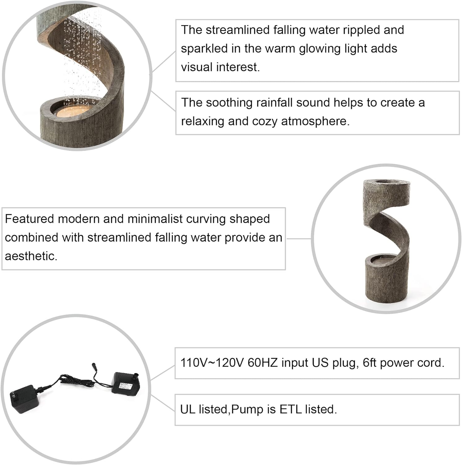 Glitzhome Tiered Outdoor Water Fountain with LED Light, Curved Outdoor Fountain Waterfall with Stone Planter, Freestanding Spiral Outdoor Garden Water Fountains, 31.3”H