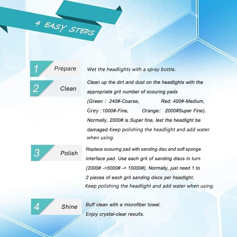• 【EASY 4-STEP】Step 1 - Prepare a spray bottle of water and drill. Step 2 - Clean with scouring pads(P240 → P400 → P1000). Step 3 - Polish with sponge interface pad and sanding discs (P2000 → P5000 → P10000). Step 4 - Shine like a new one. Physical restoration with headlight restoration pads, without any chemical fluid, safe and environmental-friendly.