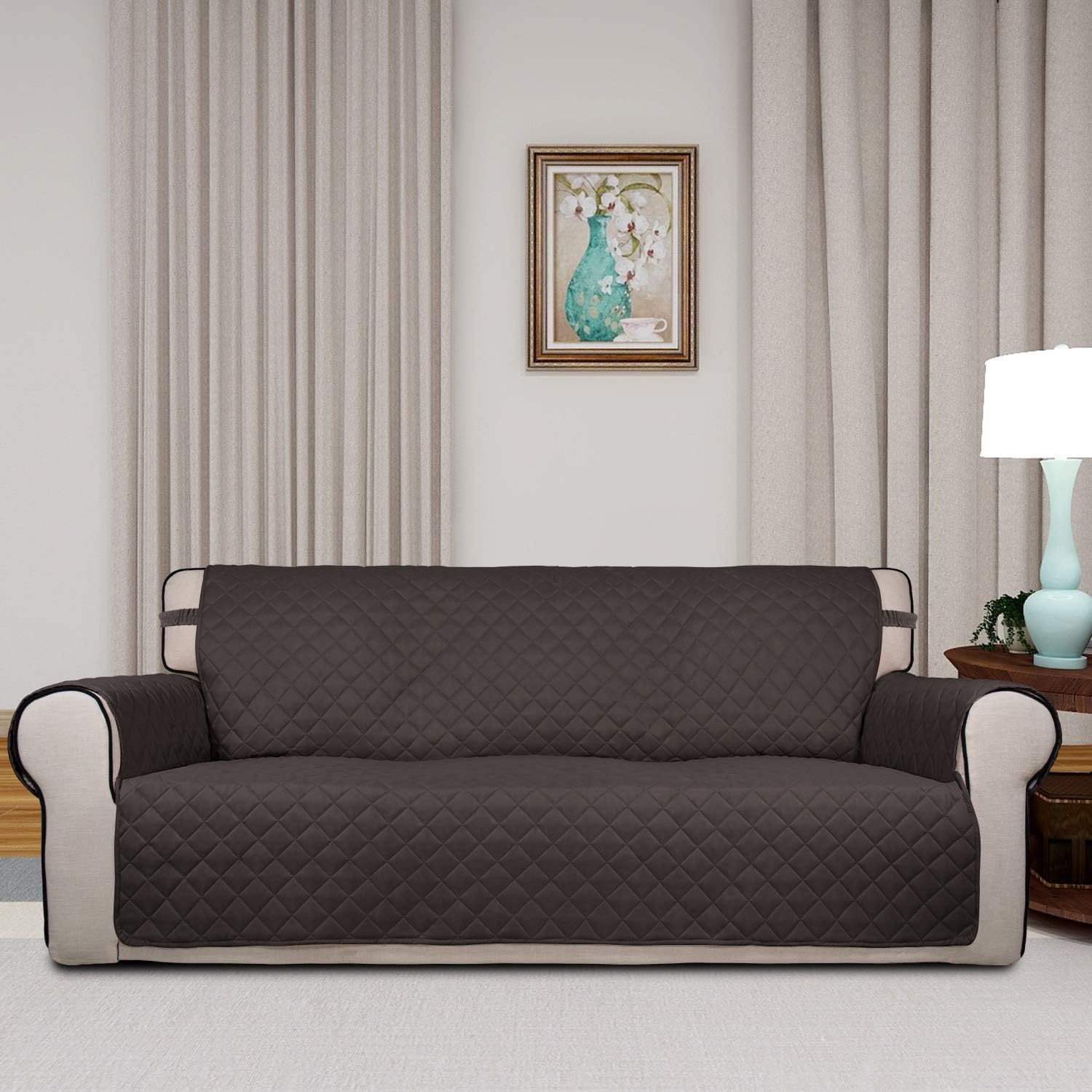 PureFit Reversible Quilted Sofa Cover, Water Resistant Slipcover Furniture Protector, Washable Couch Cover with Non Slip Foam and Elastic Straps for Kids, Pets (X Large, Chocolate/Chocolate)