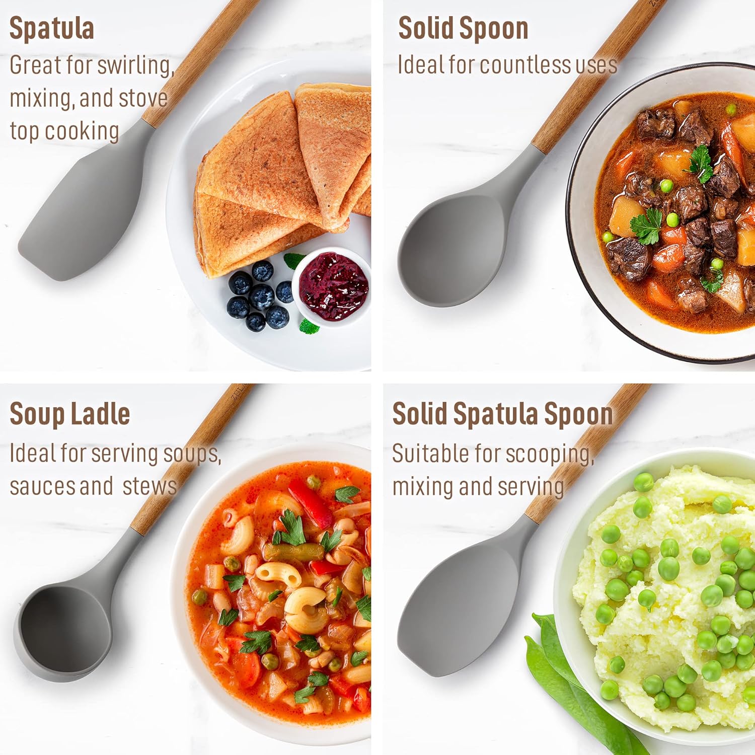 Zulay Kitchen Utensils Set Non-Stick Silicone Cooking Utensils Set with Authentic Acacia Wood Handles - 8 Piece Set - Silicone Kitchen Utensils Set with 464°F Heat Resistance - Gray