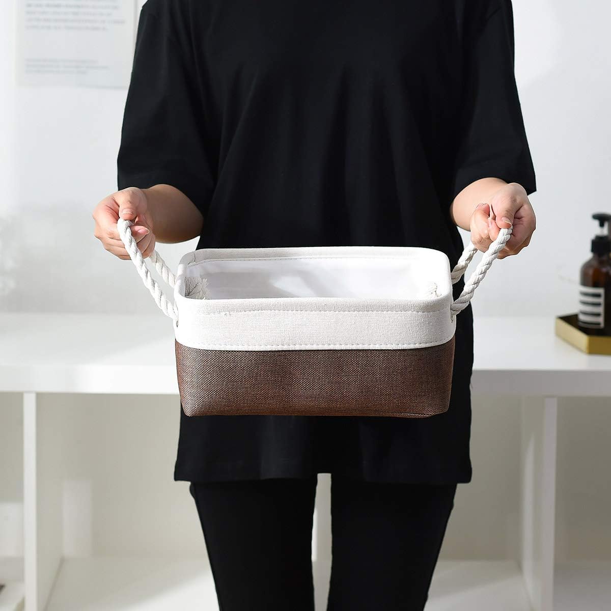 • Convenient : Made of linen and thicken environmental EVA for reliable performance. Dimensions (each): 11.8(L)x7.9(W)x5.2(H) inches.These collapsible baskets sets provides attractive, lightweight storage. Saves space when not in use and collapses flat for easy storage. These fabric baskets help keep a room looking neat and tidy. The neutral color combination fits most décor while the two side carry handles make it easy to carry
