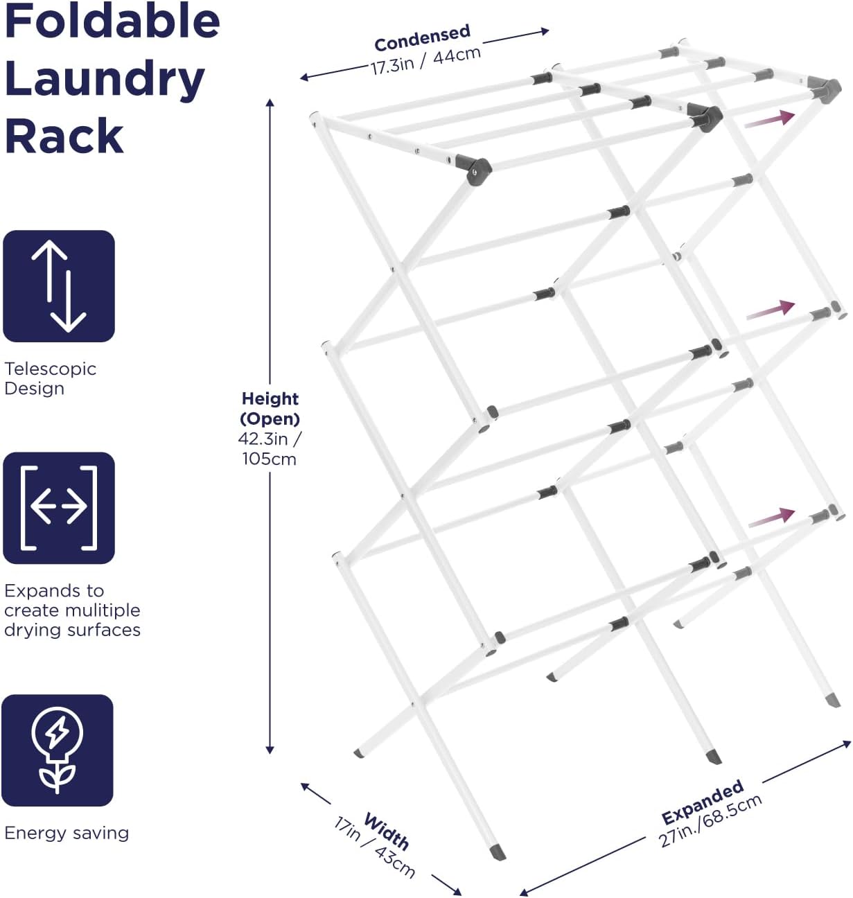 • SPACE-SAVING: Portable drying rack, you can easily fold it flat for compact storage in a closet or next to the washing machine, ready and waiting for next time Collapsed Size: 17" x 21" x 3", Partail Expanded Size: 17" x 41" x 21" Fully Expanded: 30" x 41" x 17"