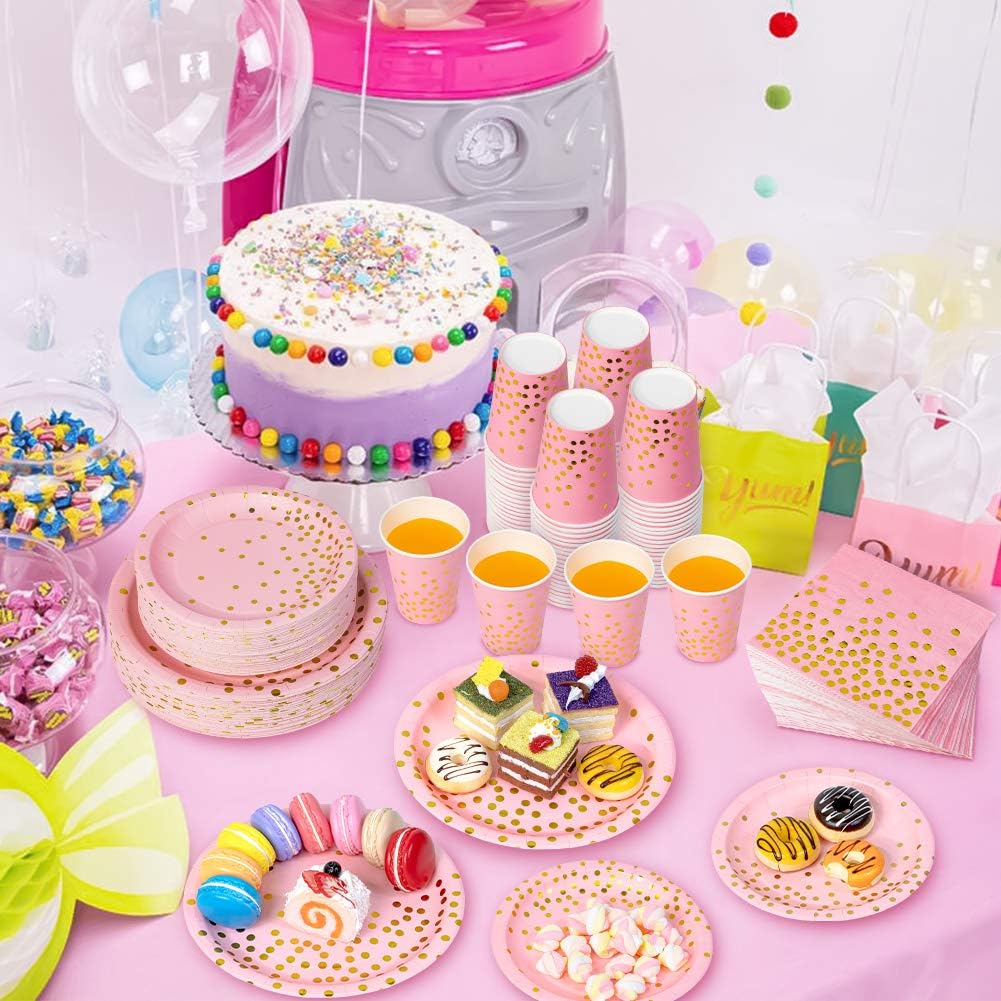 Tiblue Pink & Gold Party Supplies 350 PCS Disposable Dinnerware Set, Pink Paper Plates Napkins Cups, Gold Plastic Forks Knives Spoon for Graduation Birthday Baby Shower Wedding Bachelorette Engagement