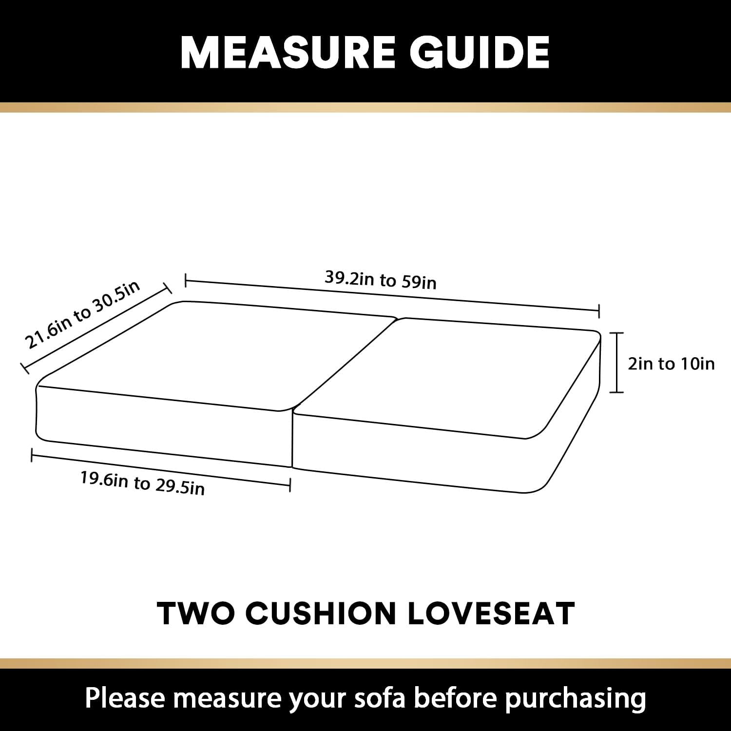 • GREAT FIT:2 piece seat cushion covers included. Each cushion cover measures: 19.6-29.5" length, 21.6-30.5" width and 2-10" thickness (height). PrinceDeco couch cushion covers are as close to custom as you can reasonably purchase. High recommended for both leather and cloth furniture.