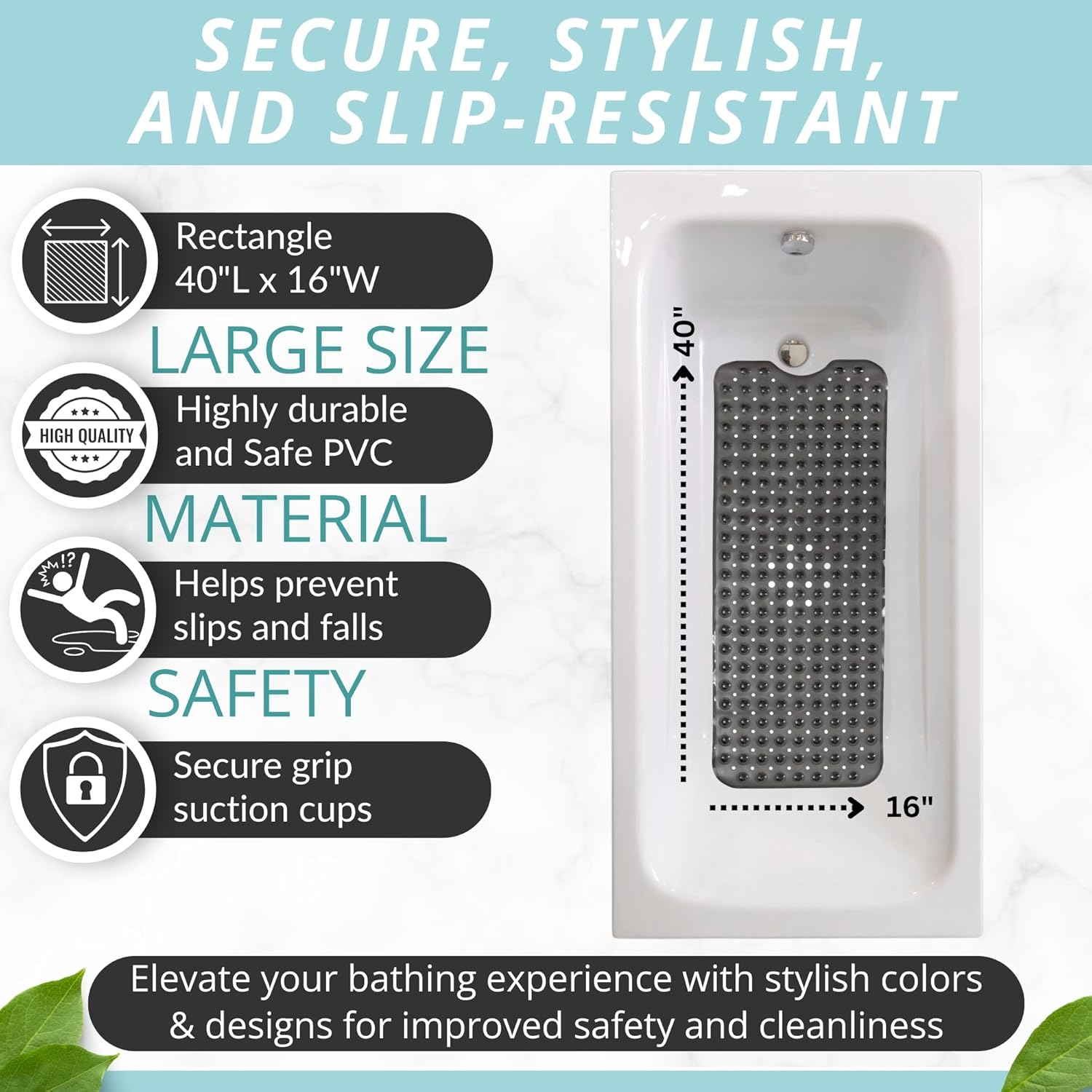 • Who Needs Slippery & Small Rubber Mats that put your safety at risk? This ergonomic shower mat comes in extra large, a full 40" x 16" size, to protectively hug your bathtub floor and prevent accidental falls